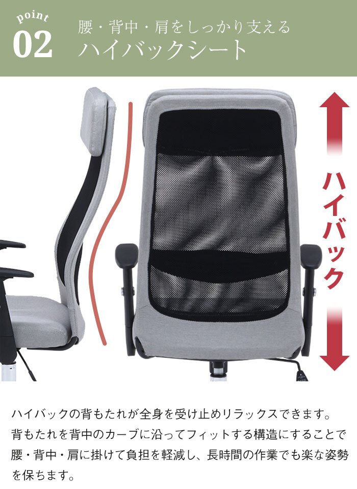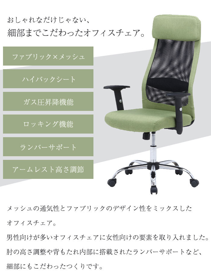 | 商品説明: | メッシュの通気性とファブリックのデザイン性をミックスしたオフィスチェア。 【商品仕様】 ■製品サイズ:約幅61.5×奥行64.5×高さ111~119cm ■座面高:約43~51cm ■重量:約10.5kg ■全体荷重:約80kg ■材質:[構造部材]金属(鋼) [張り材]ポリエステル [クッション材]ウレタンフォーム ■特徴・機能:●ガス圧昇降機能 ●ロッキング機能 ●アーム昇降機能 ●ランバーサポート ■キャスター:ストッパーなし×5 ■組立区分:組立式 ■組立時間:60分 ■生産国:中国 ■注意事項:※画面上のカラーはブラウザや設定により、実物とは若干異なる場合がございます。 あらかじめご了承の上ご注文ください。 ■カラー:グリーン ■キーワード:オフィス チェア 昇降 肘置き ハイバック メッシュ キャスター いす イス パーソナルチェア ■カラーバリエーション:他のカラーはこちら ※【カラーバリエーション】のリンクは当店のヤフオク店のページへ進みます。 |