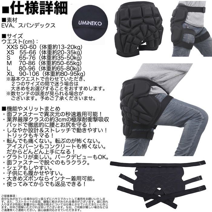 | ■■■店長のコメント■■■ ■シリーズ累計販売数20,000個突破!! ウミネコ ボディプロテクターシリーズが遂に… シリーズ累計販売数20,000個突破いたしました!! これからもお客様に大満足いただけるよう スタッフ一同頑張って参ります!! いつも本当にありがとうございます!! もう迷わせない!全人類がよろこぶ!!そんなプロテクターができました!!!!■ウミネコのプロテクターのスゴイ機能・パッパッパッと異次元の秒速着用!!・フィットするしなやか設計でトリックがキマる!!・大事なお尻と腰を徹底的に守護るッ!!・業界最厚クラス!!約3cm極厚の耐衝撃吸収パッド!!・転んでも痛くない!!転ぶのが怖くない!!アイスバーンもコンクリートも怖くない!!・ダボッとしたズボンならインナーとしても着用可能!!・ジュニア・キッズレディース対応サイズあります!!・グラトリが楽しい!!パークデビューもOK!!グラトリが楽しい!!パークデビューもOK!!・脱ぐのも楽らく!!面ファスナーをバリッと剥がすだけ!!・子供にも履かせやすくて嬉しい!!お尻にあてがって面ファスナー留めるだけのスピード着用!!・使ってみてからでも返品できるのが安心!! ■こんなお悩みはありませんか? ・まだ初心者だし・・・コケたら痛そう!痛い思いはしなくないなぁ。 ・怪我が怖くて思い切りトリックに挑戦できない・・・だけど挑戦したい! ・もっと簡単にプロテクターを着用できたらもっと手軽に楽しめるのに! ・今年はジブ・キッカー・ランプ・パークにも挑戦するぞ! ・でも結局どんなプロテクターを選んだらいいかわからない… ・履くタイプのプロテクターは窮屈に感じる。動きづらそう! ・ズボンを脱いでからプロテクターを履くって面倒。 ・子どもにプロテクターを履かせるのが大変(泣) ・汗だくになったプロテクターが脱ぎづらくてストレス! ・プロテクターを共有したいけどパンツタイプは手間がかかる! ・かといって人数分のプロテクターを買うのはちょっと高い…(汗) ・安価なプロテクターはパッドが薄いし破れやすそうで心配… ・本格的なプロテクターはちょっと敷居が高い… ・スノボ、スケート、キックボード、ジェイボード、キックバイク、釣り、アウトドアで使えるプロテクターを探している。 安心してスポーツを楽しんで頂きたい!!だから!! そのお悩みすべてウミネコが解決します!! ■ウミネコが求めた品質とは・・・ 秒速着用ピッタリフィット!!すぐ遊べる!! らくらく脱着設計で服の上からすぐに履ける!10秒後にはすぐに遊べる! やんちゃなお子様にもサッと履かせられる! 最厚クラスの約3cm極厚パッドで全尻と腰を保護!!徹底的に守護れる!! お尻をつくのが怖くなくなる!だからもっとうまくなる!もっと楽しくなる! 貴殿の「上手くなりたい」を徹底応援!「痛くない」という安心感があるから もっとたくさん練習できる!もっと上手くなれる! 独自のしなやか設計でトリックがキマる!! ブロック状のパッド配置の超ストレッチ構造だから体の動きに合わせてしなやかに動きます。からだの自由な動きを妨げないから上達も早まります! サッと脱げる!片付けもシェアもしやすい! 面ファスナーをペリッと剥がしてサッと片付けできます! あっという間に脱着できるからお友達同士やお子様同士でらくらくシェアできます! いままでは腰が重かったスポーツをもっと気軽に楽しめる! 貴殿がやりたいスポーツ全てに使用できる! アイススケート・スケートボード・インラインスケート・キックバイク・スノーボード・スキー・釣り(ロックフィッシングなど)・アウトドア・アスレチック遊びに。 こだわり機能がお財布に優しく手に入れられること。 ウミネコの商品はこれらを全条件達成!! 自信を持って喜んでいただける商品をご用意いたしました! ■秒速着用でお尻ピタフィット!!ズボンの上から面ファスナーで留めるだけすぐ着用!! ・・・秒速秒着用方法・・・ お尻にあてがって 面ファスナー留めるだけ!! 本プロテクターの使い方は超簡単! ・ズボンの上からプロテクターをお尻にあてがう ・腰、太もも上部、太もも下部のベルトを巻着付けて面ファスナーで固定する たったこれだけでピッタリフィット! 極厚のパットが腰もお尻も徹底保護します。 実際やってみるとこれが10秒もかかりません。 やんちゃに動き回るお子様に履かせる場合もとっても楽ちんですよ。 ベルトも幅広なのでフィット感は抜群!面ファスナーベルトなので、着用している服の厚さに合わせてフィット感も簡単調整できます。 こんなに手軽にプロテクションできるようになるなんて・・・(嬉し泣きキラキラ) これはほんとに試していただきたい!返品しても良いのでぜひ試してほしい!ほんとにかんたんです! ■脱ぐのは3秒!家族や友達とシェアもしやすい! しっかり固定できるのに!!ペリッと剥がして3秒で脱げます!! 本プロテクターは面ファスナーをペリッと剥がすだけでパッと脱ぐことができます。 掴みやすい最新の面ファスナーを採用しておりますので、しっかり固定で