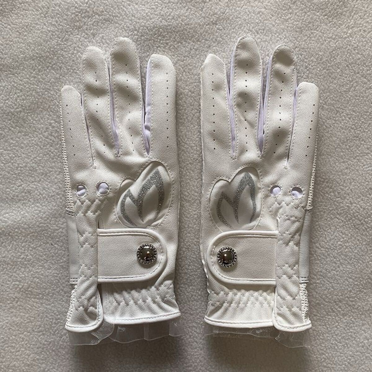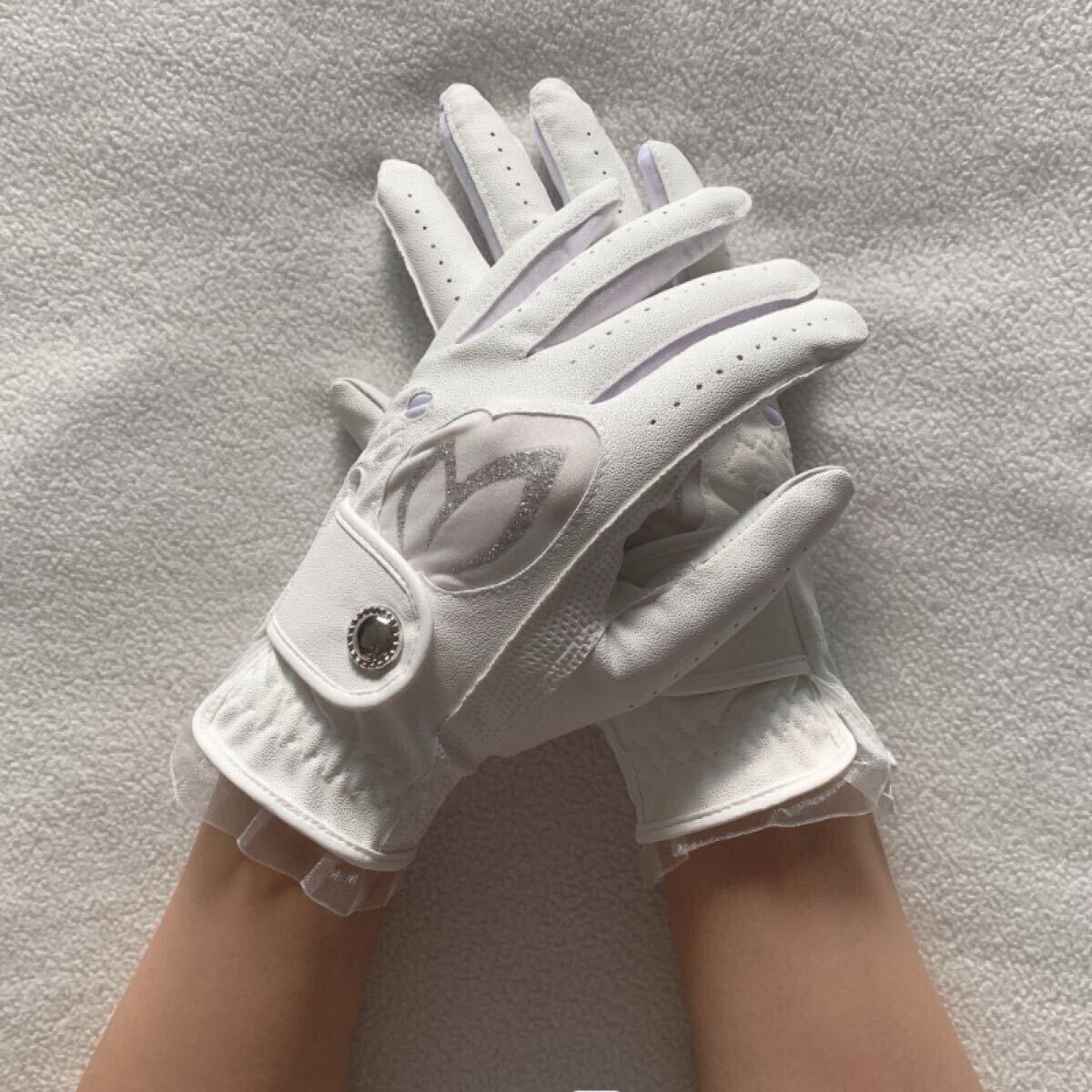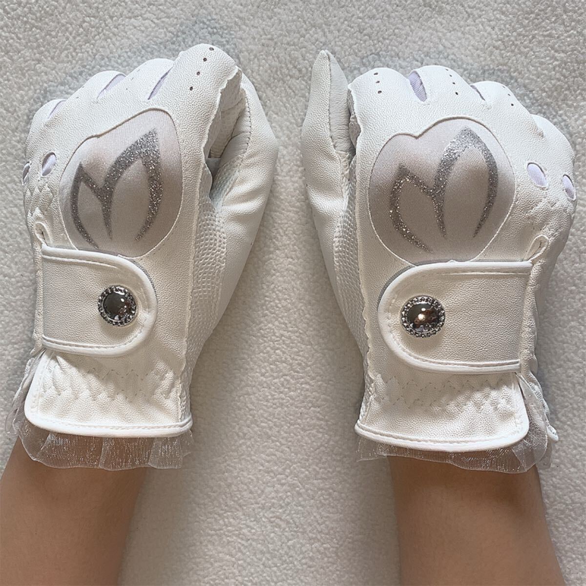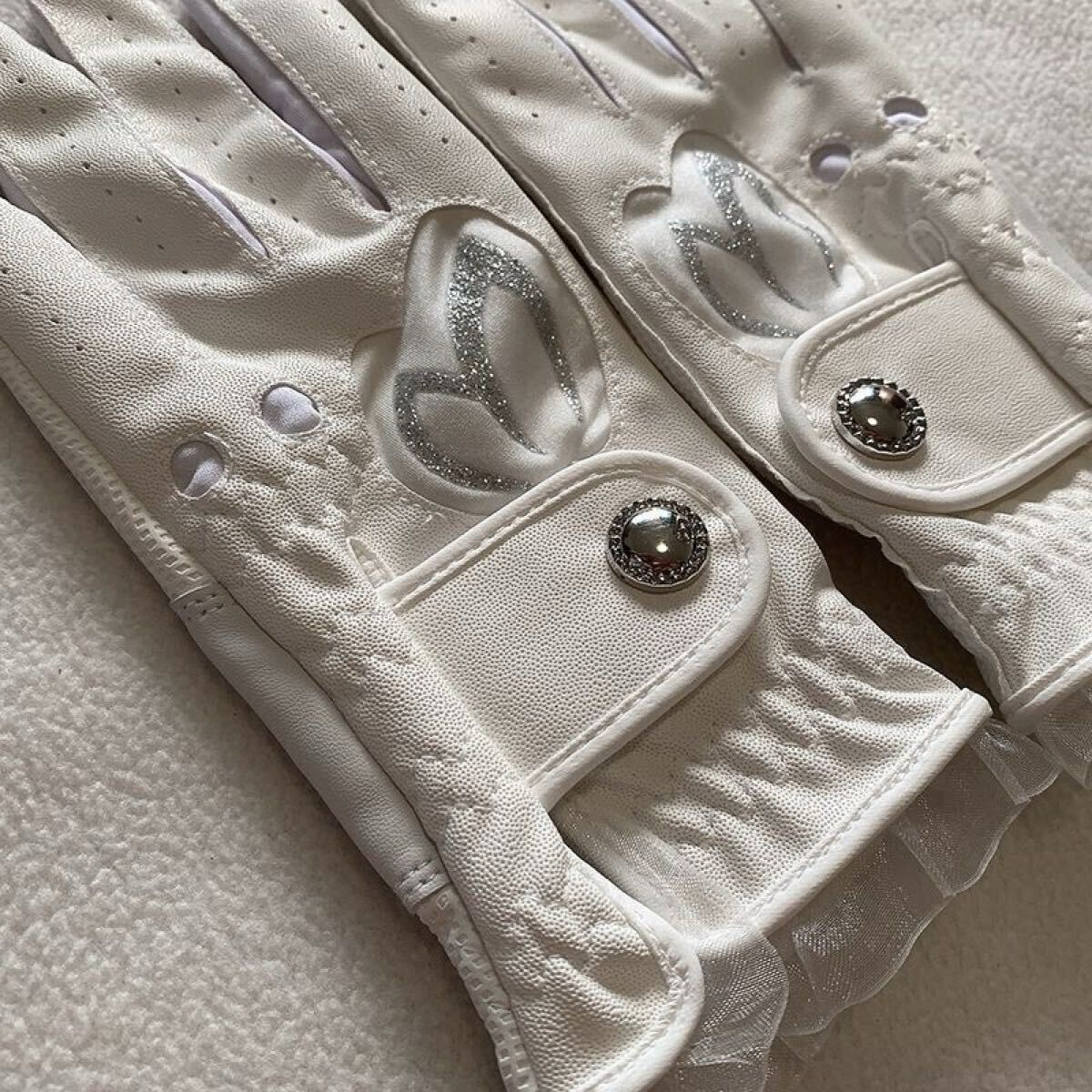 合成皮革とメッシュ素材を使用したホワイトのレディースゴルフグローブ、スパンコール装飾付き。