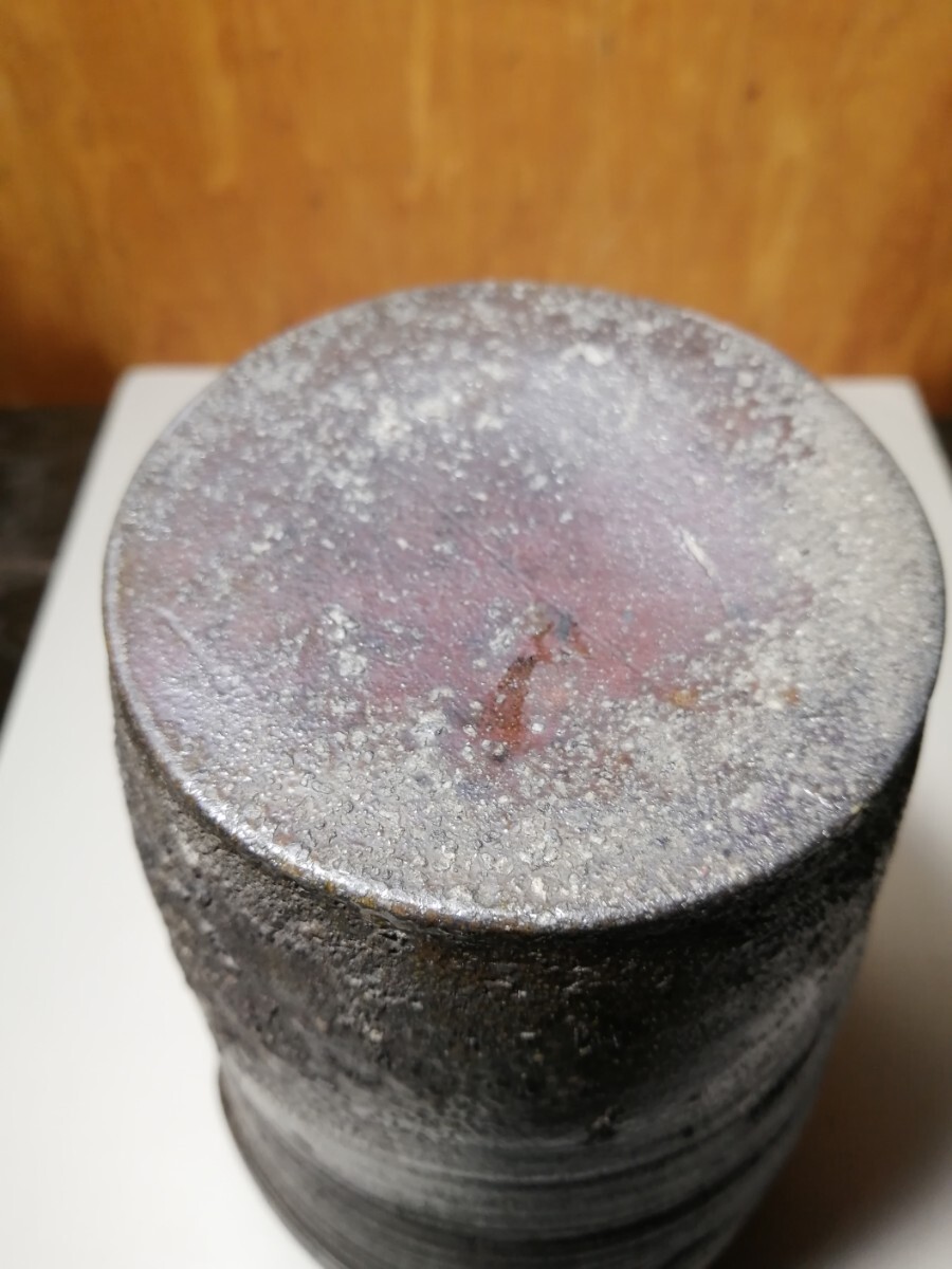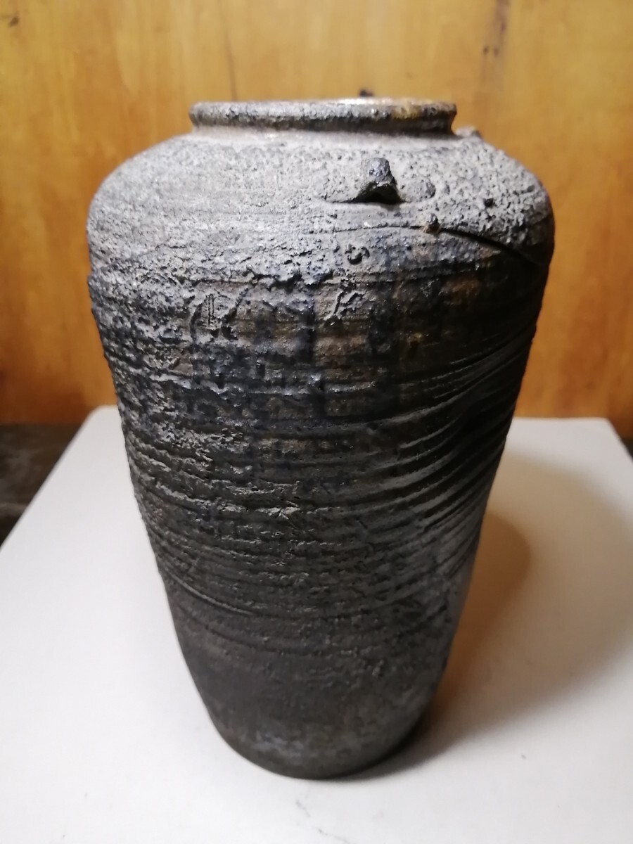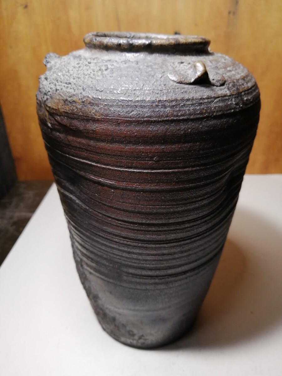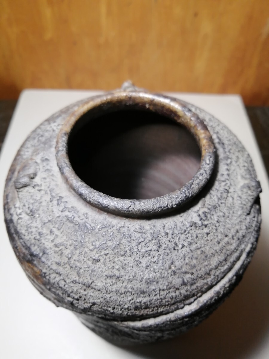 江戸中期の備前の花生けです。南蛮風な背の高い三つ耳の壺です。窯の中で肩が割れ、そのまま銅の落しを付けて伝世されています。