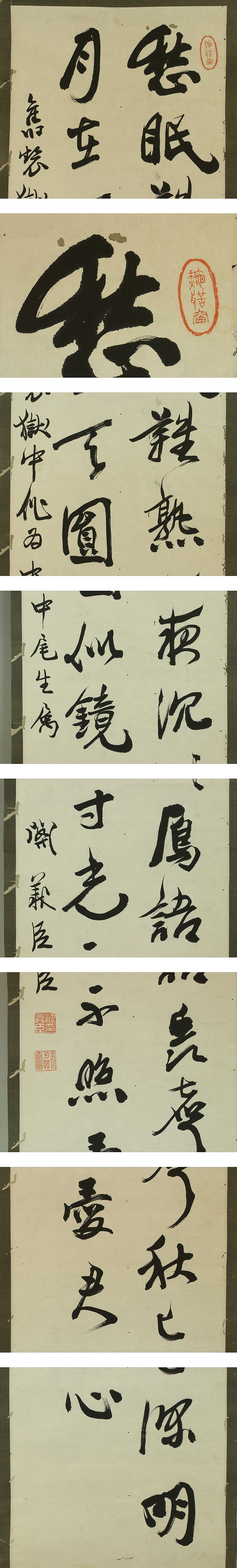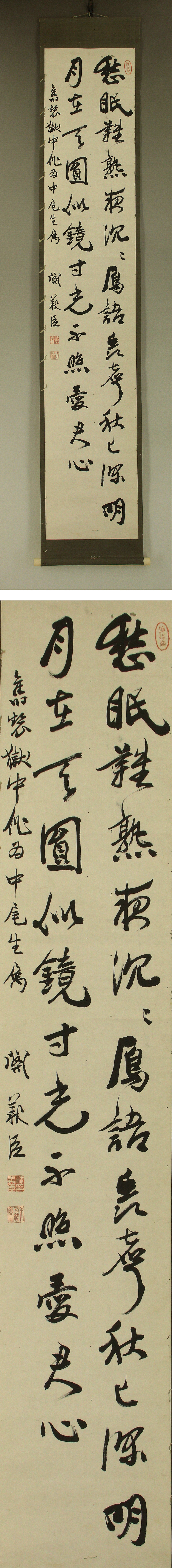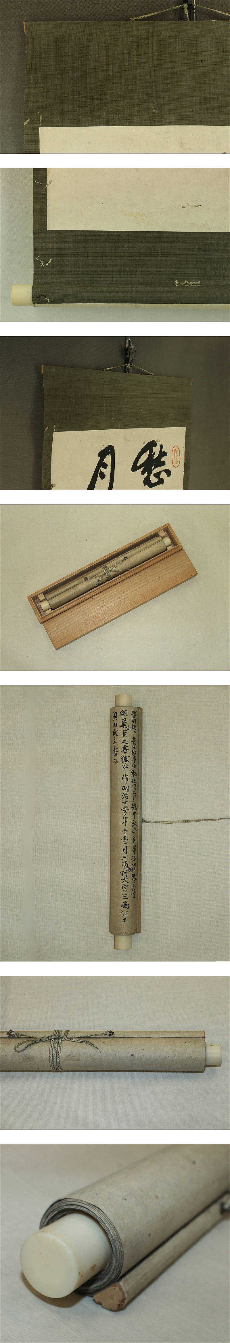 関義臣 せき-よしおみ (1839-1918) 幕末-大正時代の武士,官僚。天保(てんぽう)10年11月10日生まれ。 越前(えちぜん)福井藩重臣本多氏の家臣。藩校明道館にまなび,橋本左内らに師事。 のち坂本竜馬(りょうま)の海援隊にくわわる。 維新後,大審院検事総長心得,徳島県,山形県の知事をつとめた。 明治30年貴族院議員。大正7年3月30日死去。80歳。 本姓は山本。幼名は竜二郎。字(あざな)は季確。号は湘雲,秋声窓。 本紙は、染み、汚れ、折れ、皺、破れ、虫食、修復痕があります。 表装は、染み、汚れ、折れ、皺、虫食、破れ、剥れ、修復痕、軸先に汚れ、紐に傷みがあります。 【サイズ】 作品 横約31cm×縦約174cm 表装 横約34.5cm×縦約194cm |