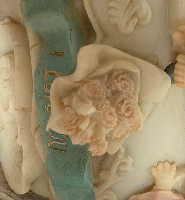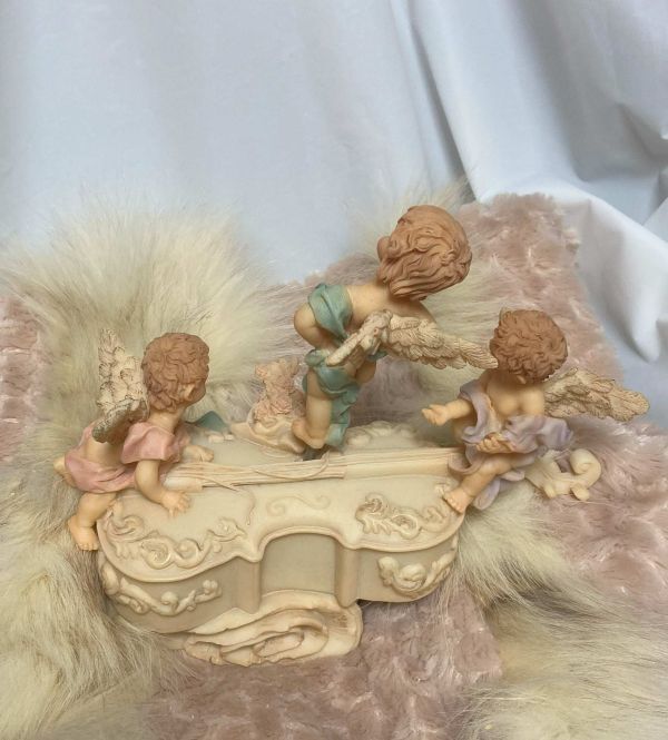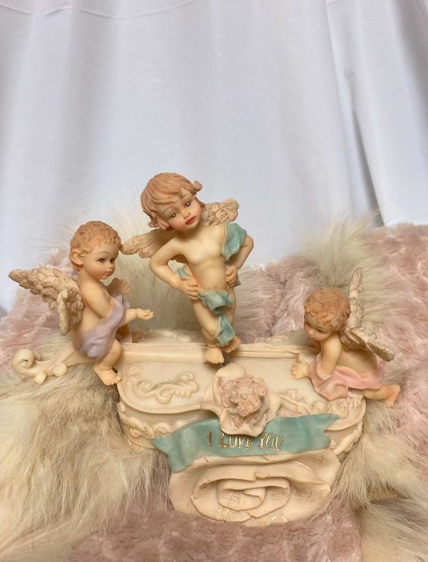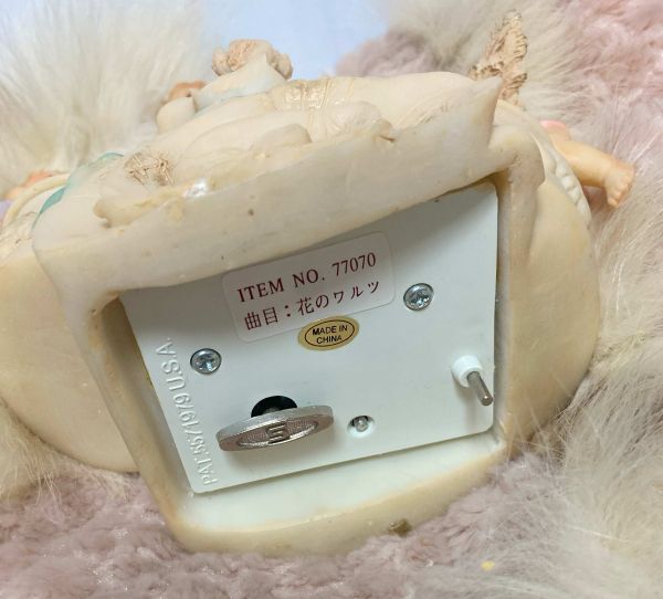 硬くて重みがあり壊れやすい陶器や樹脂のような素材です。曲名花のワルツです。オルゴールを回すと中央の天使が動き外側の天使を載せた台座がシーソーのような感じで動きます。ベージュ基調の淡い色合いなので白い内装にも合うかと思います。自然な色合いで台座見た目ケーキのようです。状態は良いと思いますが細かい細工の物なので慎重にチェックしましたが見落としはご勘弁ください。※薔薇の部分非常に細やかな細工で正解がわからないです。大きさは約横21㎝高さ18㎝です。敷物の毛皮は付属しないです。オークションでもなかなか見られない貴重なものなのでこの機会にどうぞ。