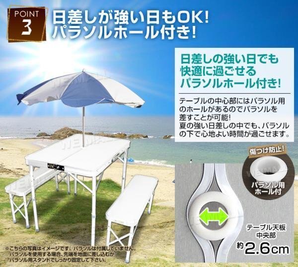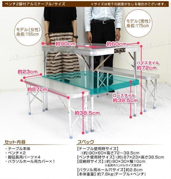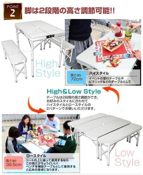 | 軽量アルミ製+取っ手付きで気軽に持ちだして、アウトドアやBBQにぴったりのテーブル&ベンチセットです。テーブルは2段階の高さ調節ができ、ローテーブルとしても使うことが可能です。キャンプ、バーベキュー、お花見などにとても便利!天板中心部にはパラソル用ホールがあるので、ベランダやテラスでの使用にもおススメです♪ |