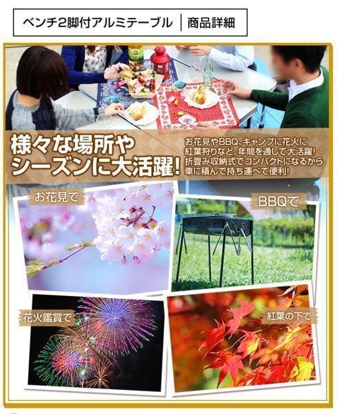 軽量アルミ製+取っ手付きで気軽に持ちだして、アウトドアやBBQにぴったりのテーブル&ベンチセットです。