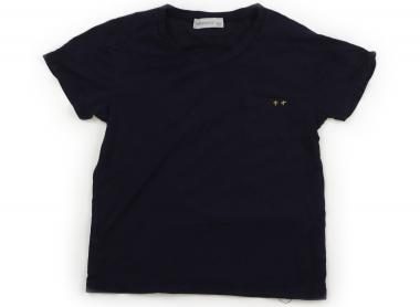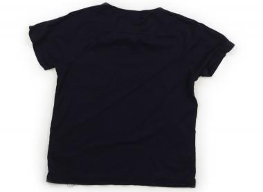 天竺コットン。サイズ表記はありません。平置き実寸でそれぞれ約、裄丈27cm/身幅67cm/サイドネックポイント~着丈43.5cm。100~110サイズ相当かと思われます。衿にヨレがあります。まだお使いいただけそうです。