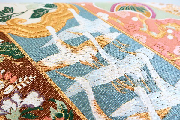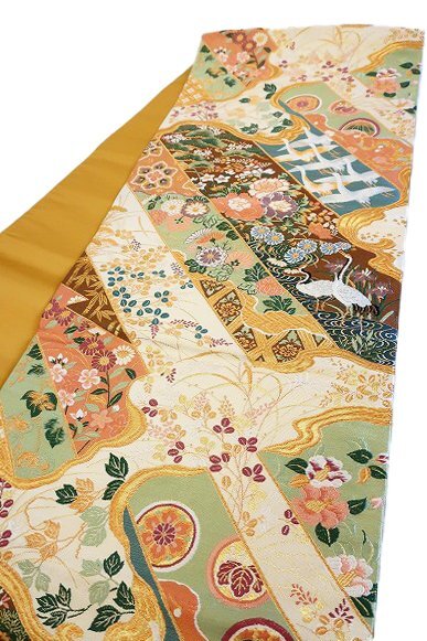 | 【送料無料】未使用品 袋帯 クリーム 鶴 菊 牡丹 吉祥文様 金糸 長さ4m41cm お洒落 仕立て上がり 正絹 フォーマル 着物フィ m-8107 |