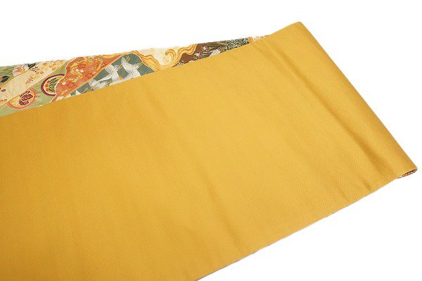 クリーム色の絹地に、鶴や菊・牡丹をはじめとした吉祥文様が織り込まれた袋帯です。 金糸がきらきらと煌めく大変豪華な一本です。 未使用品です。 担当:伊藤 |