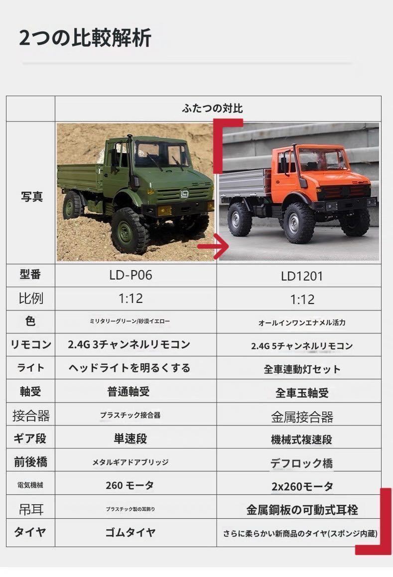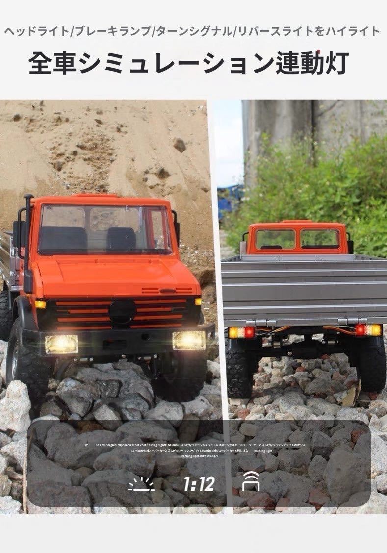 LDR/C 社最新 1/12 スケール 2.4G 四駆RC カー ウニモグ LD1201 前後はデフロック式ブリッジアクスル(メタルブリッジギヤ)、前後ブリッジはメカニカルデフロック式。ホイール減速機の性能により、車両の減速トルクを向上させます。 2段階機械式変速 ライト付き ミリタリー クライミング トラック フルプロポーショナル ビークル トラック