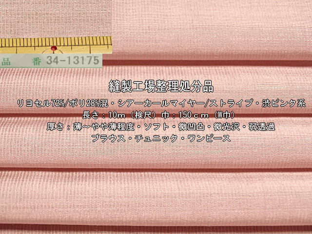 | 商品説明 | 縫製工場様からの整理・処分品の激安処分です。 商品知識は御座いませんが、大量の余財を処分させて頂きます。 商品は、リヨセル72%/ポリ28%混・シアーカールマイヤー ストライプ・色調は、渋ピンク系でございます。 長さは、10m(検尺)巾は、150cm(W巾)です。 厚さは、薄~やや薄程度・ソフト・微凹凸・微光沢 弱透過でございます。 ブラウス・チュニック・ワンピースなどにいかがでしょうか。 この機会にお試し下さい。 |
