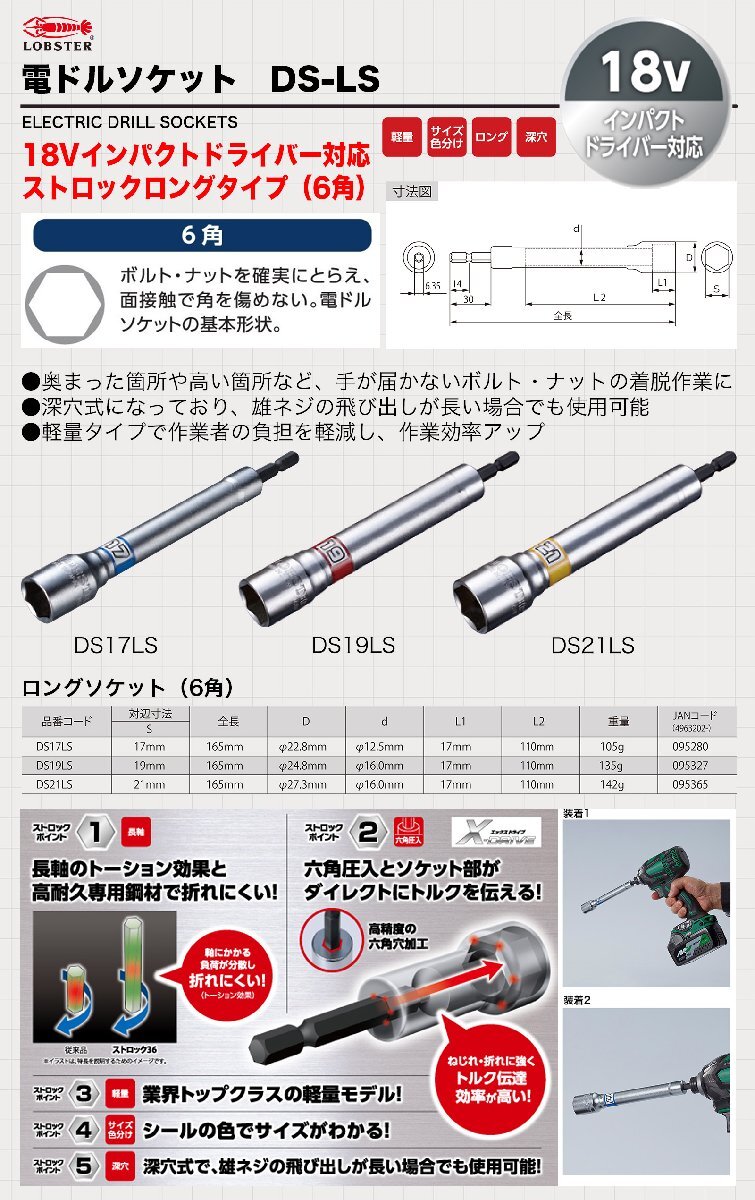 LOBSTER(エビ印)電ドルソケット ロング6角 DS17LS 〔ストロック ロングソケット DS-LS〕