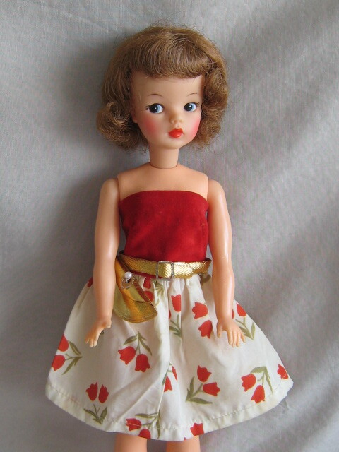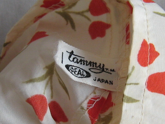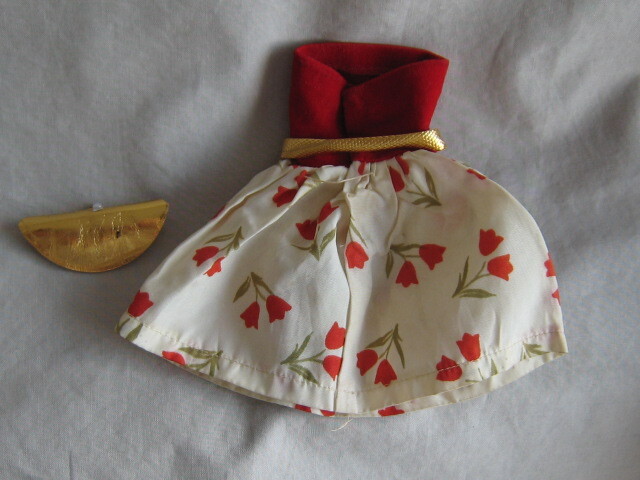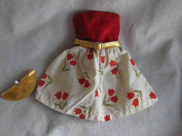タミーちゃんのオリジナルタグ付きのワンピースです。身頃がビロードで、スカート部分は、張りのあるチューリップ模様の素材です。それに、オリジナルのゴールドのベルトとクラッチバッグが付属しています。