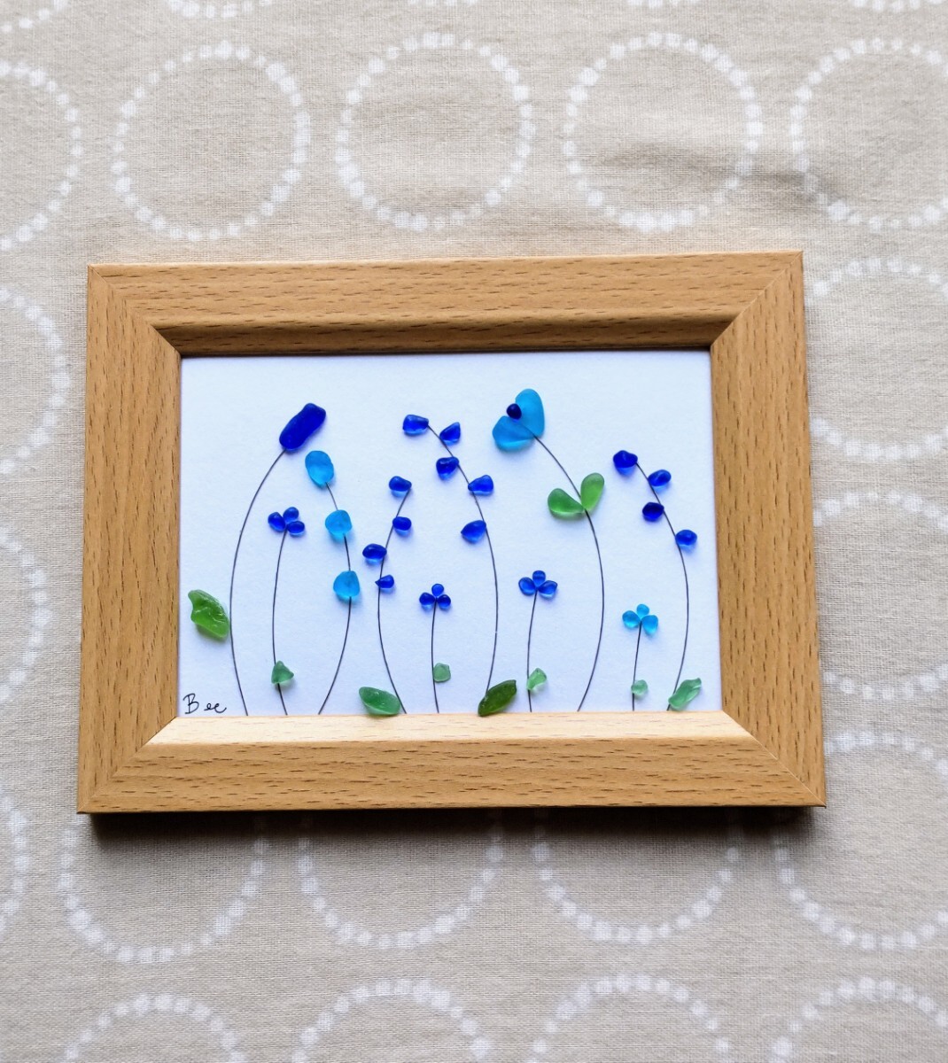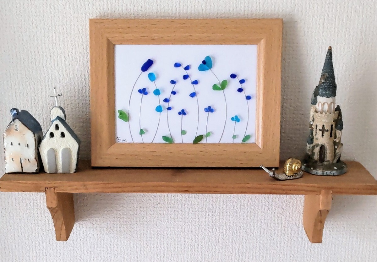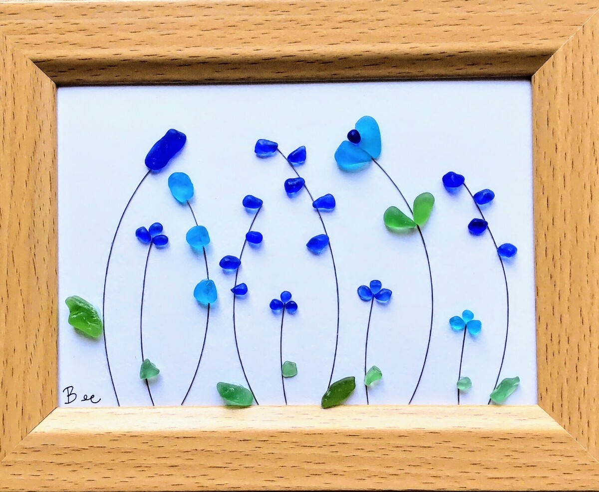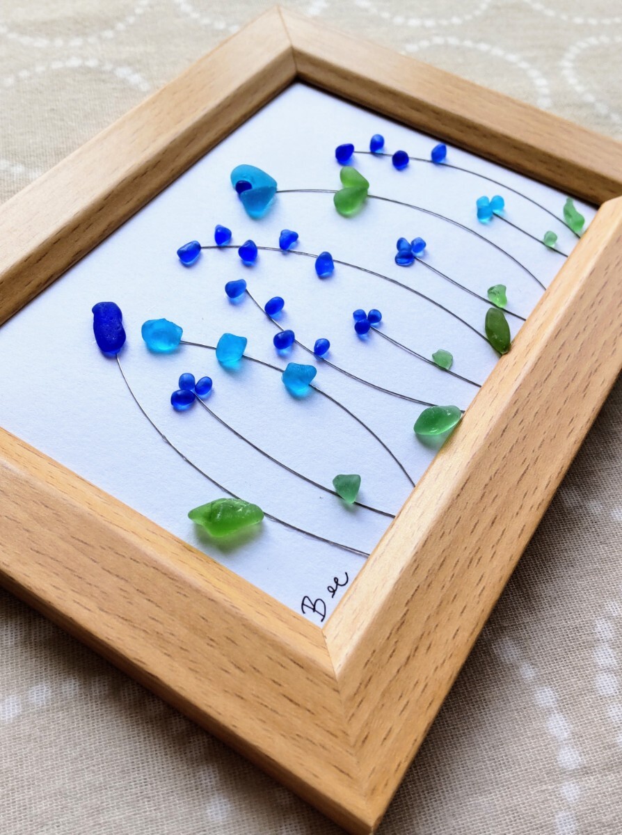 シーグラスを使って、庭に咲く小花たちをイメージしました。茎にはステンレスの針金を使っています。ハガキサイズ。