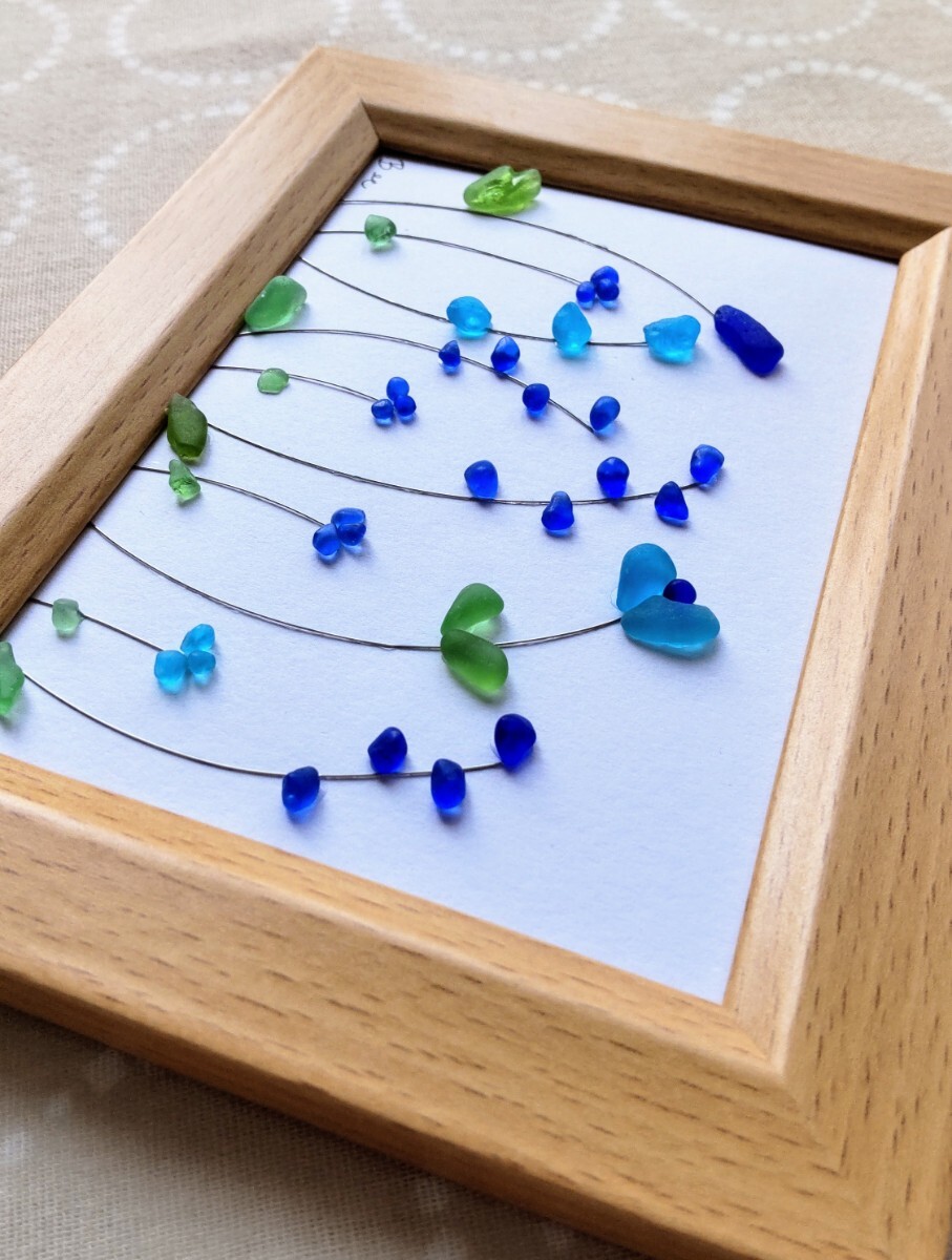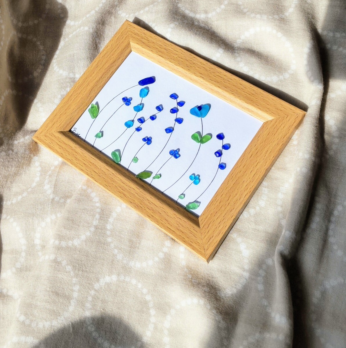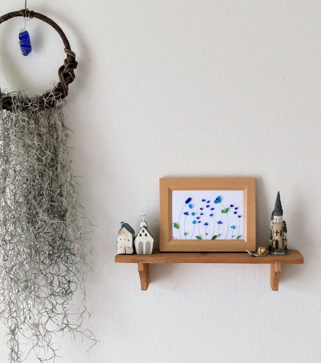 シーグラスを使って、庭に咲く小花たちをイメージしました。茎にはステンレスの針金を使っています。ハガキサイズ。