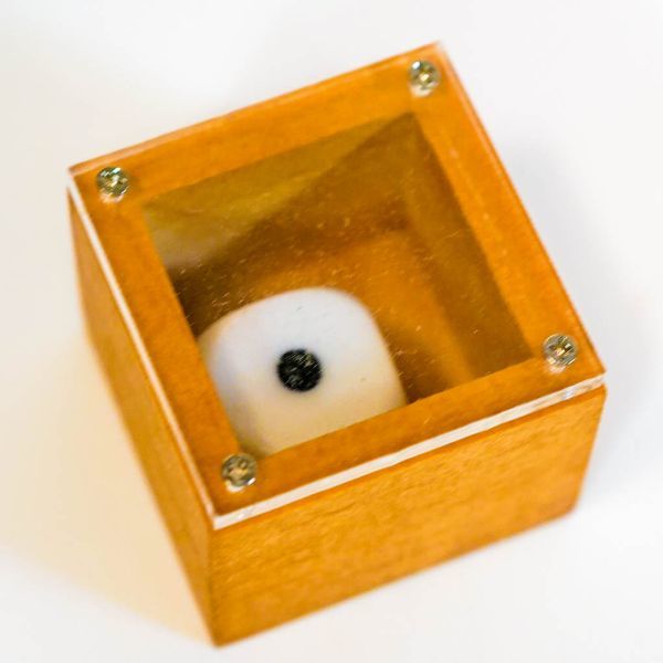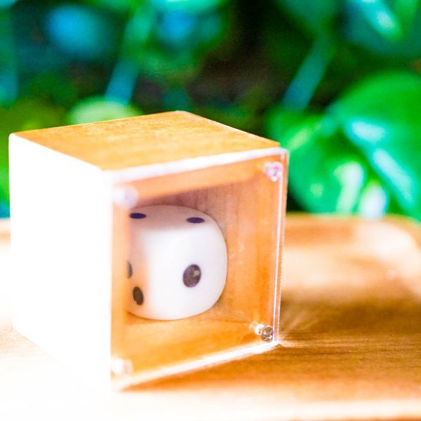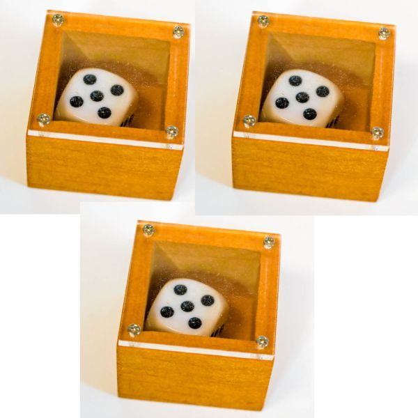 高級感のあるデラックスタイプです。木製の箱の上部がクリアのアクリルでできたものを示します。中には1個のダイスが入っています。観客に渡してよーく調べてもらいます。いくら調べてもダイスが回転することはありません。ここで、観客に1から6の間の数字を自由に1つ言ってもらいます。例えば「4」と言ったとします。マジシャンはケースを手の上に乗せて軽く傾けると・・・なんと、ダイスの目は瞬間に観客の言った「4」になっているのです!そのままケースを観客に渡して調べてもらいますが、やはりダイスはまったく回転しません。