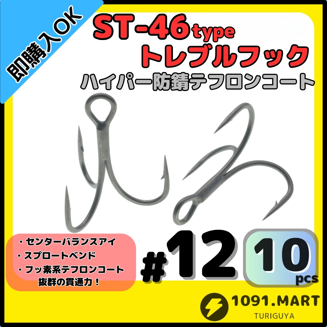 【送料無料】ST-46タイプハイパー防錆トレブルフック テフロンコート#12 10本セット 高品質ルアーフック ソルト対応 トリプルフック 釣り針