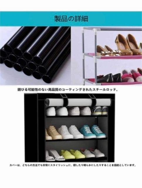 【組み立てや利便性】 靴のラックは比較的軽量ですが、安定しています。組み立てが簡単す。 【大容量?サイズ】 サイズ:画像をご参照ください。 6層の靴ラックは、36足の女性用シューズを配置することができます。 【高品質素材】 靴ラックは、鋼管、PPプラスチックコネクタ、不織布から組み立てられます。 不織布カバーは通気性、防湿性、柔軟、無毒、非刺激性です。 鋼管の表面は滑らかで耐摩耗性があり、プラスチックコネクタも安定しています。 【ユニークデザインとマルチファンクション】 各レイヤーの高さが17cmなので、ハイヒール、カジュアルシューズ、スポーツシューズなど、各層間のスペースに様々な種類の靴を収納できます。 最も重要な点は、調整することもでき、1層または2層を取り外してブーツやその他の大きなアクセサリーを片付けることもできます。 布カバーは、ベルクロでロールアップして固定したり、ジッパーで閉じたりすることができます。それは効果的にほこりを隔離します。
