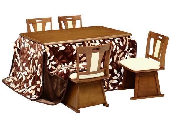 ハイタイプこたつ/ダイニングコタツ こたつRARUGO135センチ幅、長方形+椅子4脚+布団の6点セット ブラウン色135×85センチ巾の落ち着いたテイストの家具調ハイタイプこたつテーブルに、回転式 椅子4脚と掛け布団まで付いた6点セット。寒い冬は天板と本体の間にふとんはさんでハイタイプコタツとして、春夏秋は布団を取り外して天板を固定し、ダイニングセットやデスクにと年中お使いいただけます。ヒーターは薄型ですからテーブルとして使用時にヒーターは外からは見えません。立ち座りが楽で、膝の痛むシルバーの方にも最適です。暖卓サイズ:幅135×奥行85×高さ67■天板:MDF転写 UV硬質ウレタン塗装●600Wハロゲンヒーター 手元電子コントローラー(MHU-601E)椅子サイズ:幅46×奥行51×高さ75×座面高41センチ■構造部材:天然木ラバーウッド 張り生地:合成皮革(PVC) 回転式 組立式(座部と脚部の取付式)布団サイズ:幅287×奥行237■表生地:フランネル 裏生地:フランネル※お届けに約10日掛かります。お届け日のご指定を承りますのでご指定下さいませ(地区によりお受けできません)☆落札、ご入金確認後 1~2日にて発送いたします 追加納期のかかるものは商品ページに記載いたしております よろしくお願いいたします。