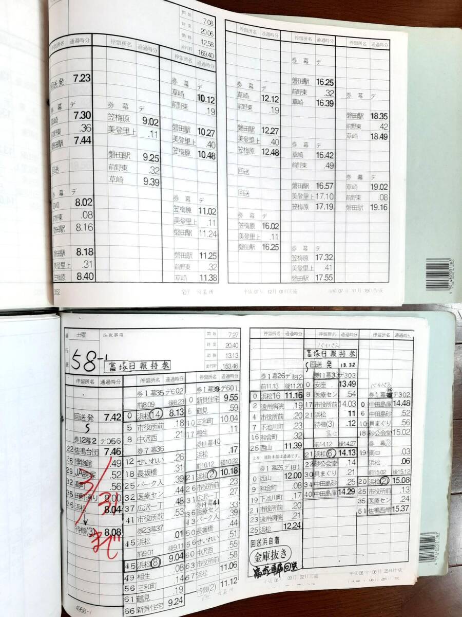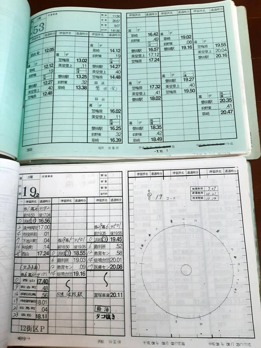 平成時代に浜松・袋井・福田・竜洋の各営業所で使われていた実物資料で、路線バスのダイヤや運行状況が詳細に記されています。