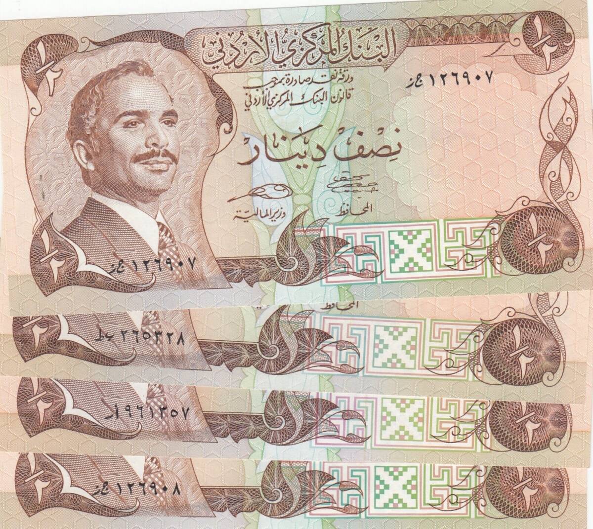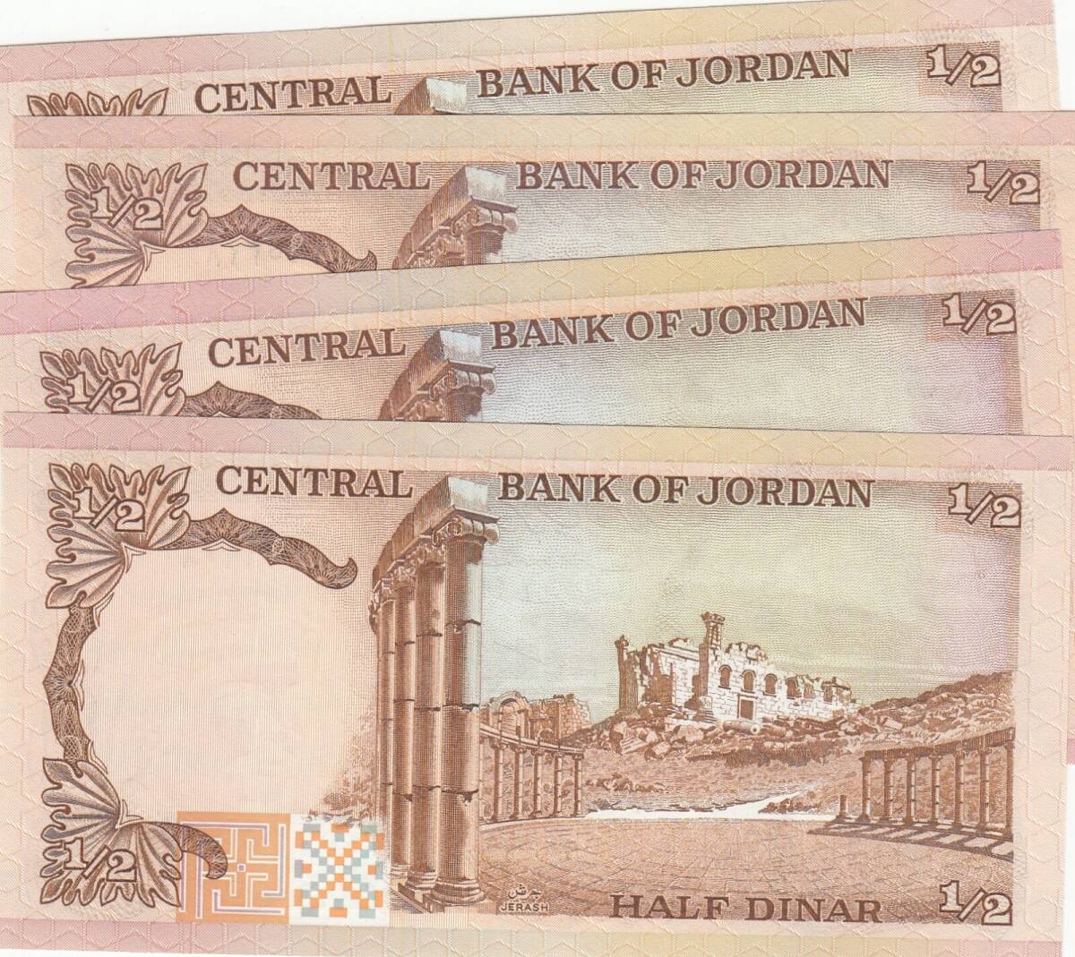 大量 ジョルダン 4枚 半ディナール 1975年 P-17 全て 未使用 ピン札 海外 外国 貨幣 紙幣 古札 Jordan