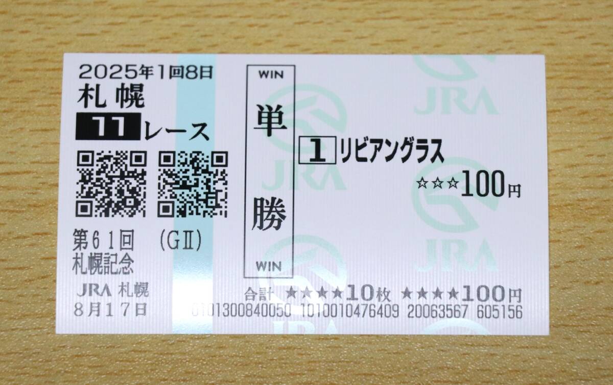 リビアングラス 札幌 11R 札幌記念 (2025年8/17) 現地単勝馬券(札幌競馬場)です。気に入って頂けた方の落札を心よりお待ちしております。 商品は定型郵便(110円)又は又はゆうパケットポストminiで発送となります。 厚さの関係上、定型郵便の場合は片面段ボール補強、ゆうパケットポストの場合は両面段ボール補強となります。どうかよろしくお願い致します。