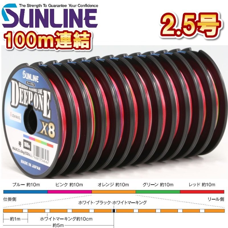 サンライン 2.5号(45LB) ディープワン×8 100m連結 5色分け マルチカラー 日本製 国産8本組PEライン DEEP ONE x8