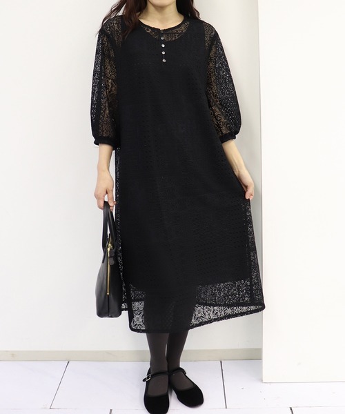 キーワード:ワンピース フレア ミモレ丈 レース 七分袖 五分袖