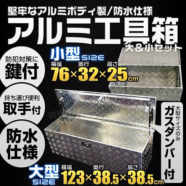 高い耐久性をもつ頑丈なアルミ工具箱です。 大切な工具や道具、電動器具を安心して保管できます。 持ち運びに便利な取っ手が両側に付いています。 大小セットでお得です!! 【仕様】 (大型) 寸法:幅1230×奥行385×高さ385mm 重量:約13kg 材質:アルミ 防水構造・ロック付 (小型) 寸法:幅760×奥行320×高さ250mm 重量:5.4Kg 材質:アルミ 防水構造・ロック付 工具 アルミ 物置 工具箱 道具箱 保管箱 ツールボックス 工具ボックス アルミボックス 荷台箱 |