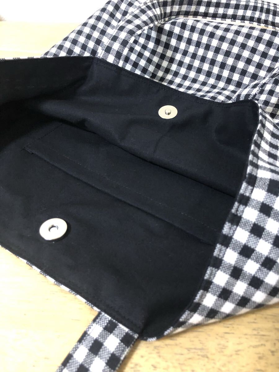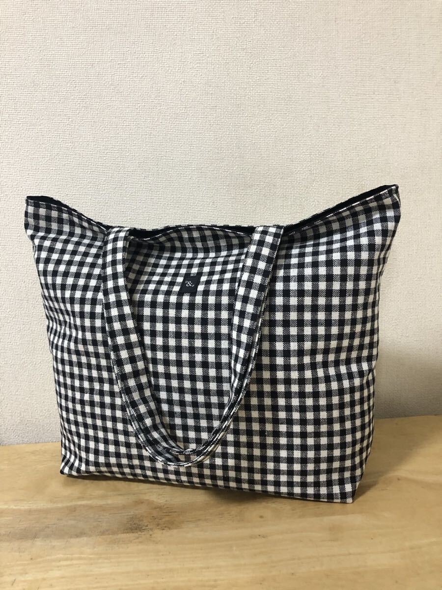 アクセスありがとうございます。黒ギンガムチェック柄の生地で大きめ肩掛けトートバックを作りました。サイズは縦30×横40まち10持ち手48センチです。まちをたっぷりとっておりますので荷物も沢山入りますよ。送料はレターパックライト430円でお届けできます。他にも出品しておりますので宜しければご覧ください。