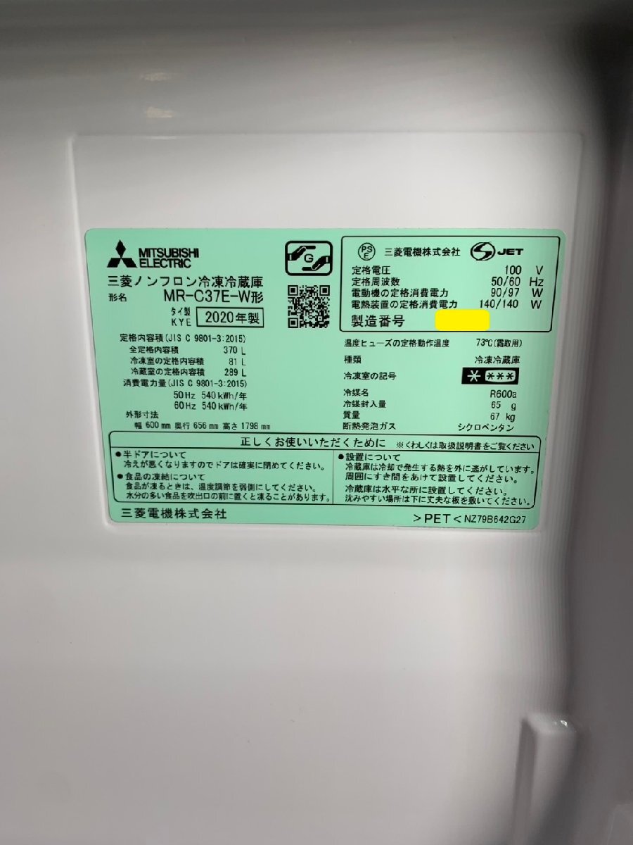 【大阪/岸和田発】MITUBISHI/三菱 3ドア 冷凍冷蔵庫 MR-C37E-W Cシリーズ ホワイト 370L ビックフリーザー |