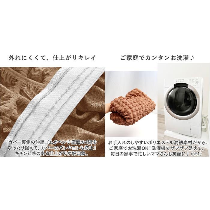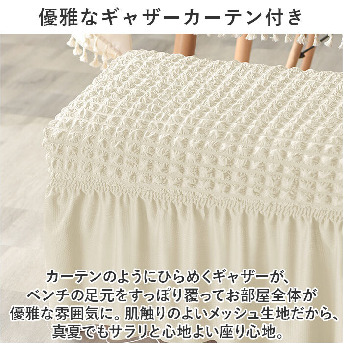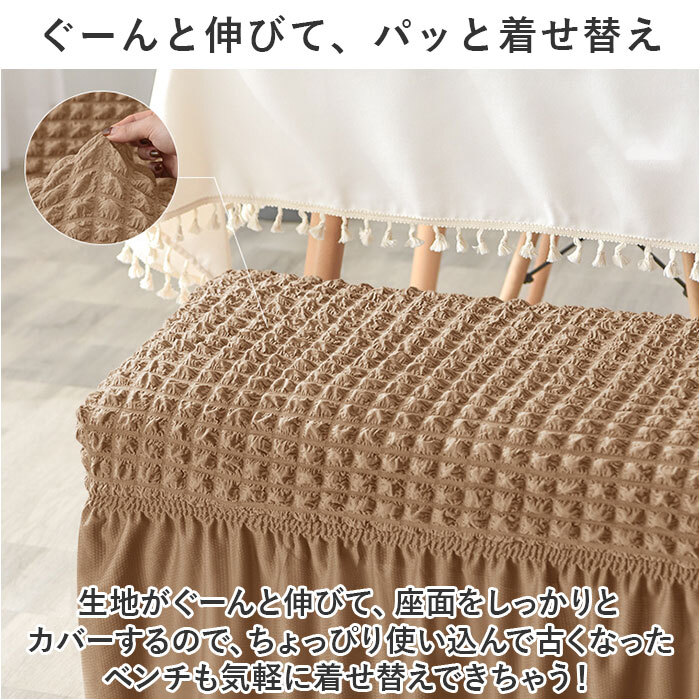 | 商品説明 | ・・ひらりと揺らめくギャザーで、ベンチチェアがエレガントに変身!取り付け簡単「ベンチシートカバー」が新登場。 ・【今お使いのベンチにフィット!】 ・タテ・ヨコに程よく伸縮するストレッチ素材が、ダイニングベンチやロングスツールなど、背もたれのないタイプの長椅子にぴったりフィット! ・【ぐーんと伸びて、パッと着せ替え】 ・生地がぐーんと伸びて、座面をしっかりとカバーするので、ちょっぴり使い込んで古くなったベンチも気軽に着せ替えできちゃう! ・【ぽこぽこワッフル素材が可愛い】 ・座面部分の生地には、ぷっくりとした立体感が特徴のエンボスワッフルニットを採用。ふんわりとしたボリューム感とポップな見た目でトレンド感抜群! ・【優雅なギャザーカーテン付き】 ・カーテンのようにひらめくギャザーが、ベンチの足元をすっぽり覆ってお部屋全体が優雅な雰囲気に。肌触りのよいメッシュ生地だから、真夏でもサラリと心地よい座り心地。 ・【外れにくくて、仕上がりキレイ】 ・カバー裏側の伸縮ゴムがベンチ座面の4隅をぴったり捉えて、カバーのズレやヨレも防止!キチンと感のある仕上がりが好印象。 ・【お子さまやペットのいるご家庭に】 ・お子さまの食べこぼし汚れや、ネコちゃんの爪とぎ跡でくたびれてしまったベンチも簡単イメージチェンジ! ・【オフィスやショップのベンチにも】 ・家庭用のダイニングベンチだけでなく、オフィスやショップ、クリニックの待合室用など、ビジネスシーンでも大活躍。 ・【ご家庭でカンタンお洗濯♪】 ・お手入れのしやすいポリエステル混紡素材だから、ご家庭でお洗濯OK!洗濯機でザブザブ洗えて、毎日の家事で忙しいママさんも笑顔に♪(※1) ・【選べるカラーで、気持ち華やぐ】 ・お部屋の雰囲気に合わせてチョイスできる、ベーシック&くすみカラーのバリエーション。季節ごとにお気に入りのカラーで模様替えをすれば、お部屋も気持ちもリフレッシュ! |