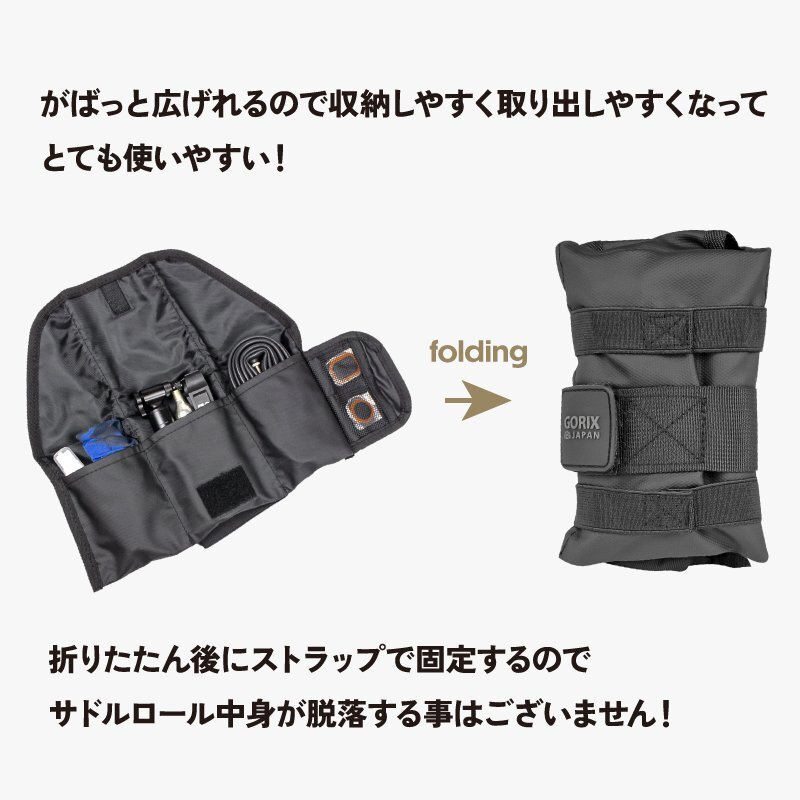 サドルバッグと違いくるくる巻く事で無駄なスペースを失くして効率の良い収納ができます。 中身の収納スペースも区分けされてあり、すぐにどこに何があるかを判別できます。 このサイズでパンク修理類やチューブなどを収納する事ができる。 生地も丈夫で柔軟性、耐久性と防水性があり屋外で使用するのに扱いやす素材となっています。 装着も簡単でサドルバッグとして、またフレームにも装着可能です。 ロードバイクやクロスバイク、MTB、ミニベロ、グラベルなど様々な自転車に! [コンパクトサイズ] くるくる折りたたむ事で容量は十分あるのにとてもコンパクトになるサドルバッグ。 サイクル走行に必要な携帯ポンプやパンク修理類はしっかりと収納できます。 外観は軽装に見えてスマートで良く見た目とは裏腹に容量は多い。 [素材] 屋外での使用に適している伸縮性のある生地で防水撥水機能を持ち合わせています。 サドルロール本体も軽量で柔軟で扱いやすい。 PU素材使用で丈夫で摩擦や破れに強く、耐久性に優れています。 (ファスナーは非防水のため、完全防水ではありません) [多収納] 3つのメインポケットには工具やパンク修理用具、チューブ、空気入れ、軍手、エネルギー食品などアイディア次第で様々な物を収納できる。 また小さいメッシュポケットにはパッチ類などそしてジップポケットには小銭などの収納に! がばっと広げれるので収納しやすく取り出しやすくなってとても使いやすい。 折りたたん後にストラップで固定するのでサドルロール中身が脱落する事はございません。 [取り付け簡単] ストラップをサドルレールやフレームに巻き付けベルクロで留めるだけで装着できます。 短時間で外す事ができるので着脱は面倒でなくスムーズに行えます。 サドルバッグだけでなくフレームに取付可能なのでフレームバッグとしても機能します。 きつく締付ける事で安定性もあり横揺れを防止。 商品内容サドルバッグ(サドルロール) 素材PU、ポリエステル サイズ折畳時:15x10.5cm / 展開時:33x29cm / センターベルト幅 3.7cm 重量112g |