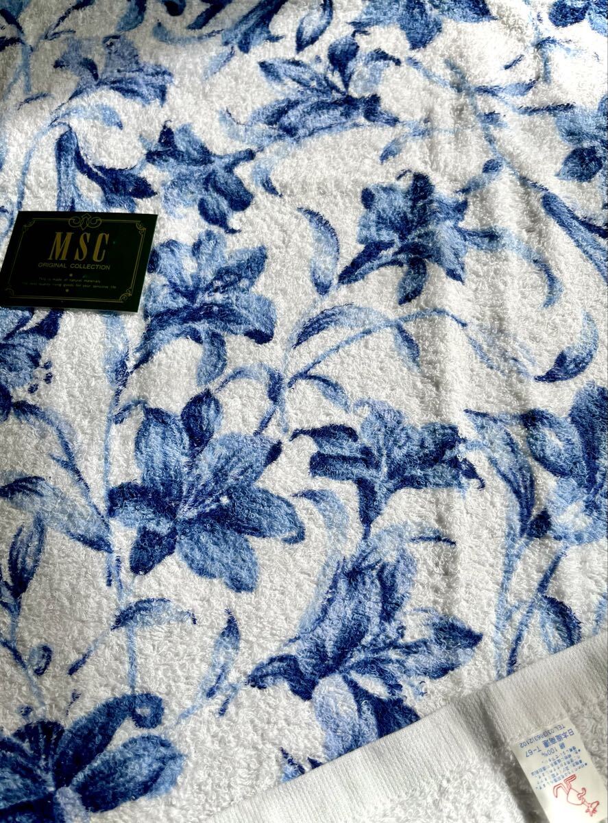 箱入り新品未使用の、涼しげなネービーブルーのユリ花柄のバスタオルです。