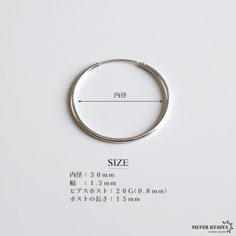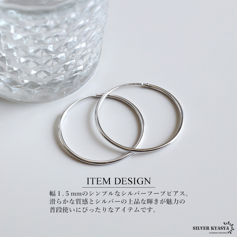 幅1.5mmのシンプルなシルバーフープピアス。滑らかな質感とシルバーの上品な輝きが魅力の普段使いにぴったりなアイテムです。
