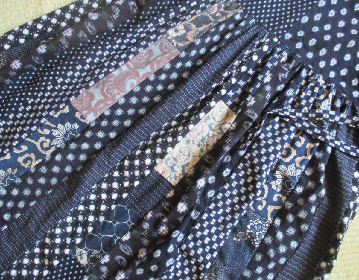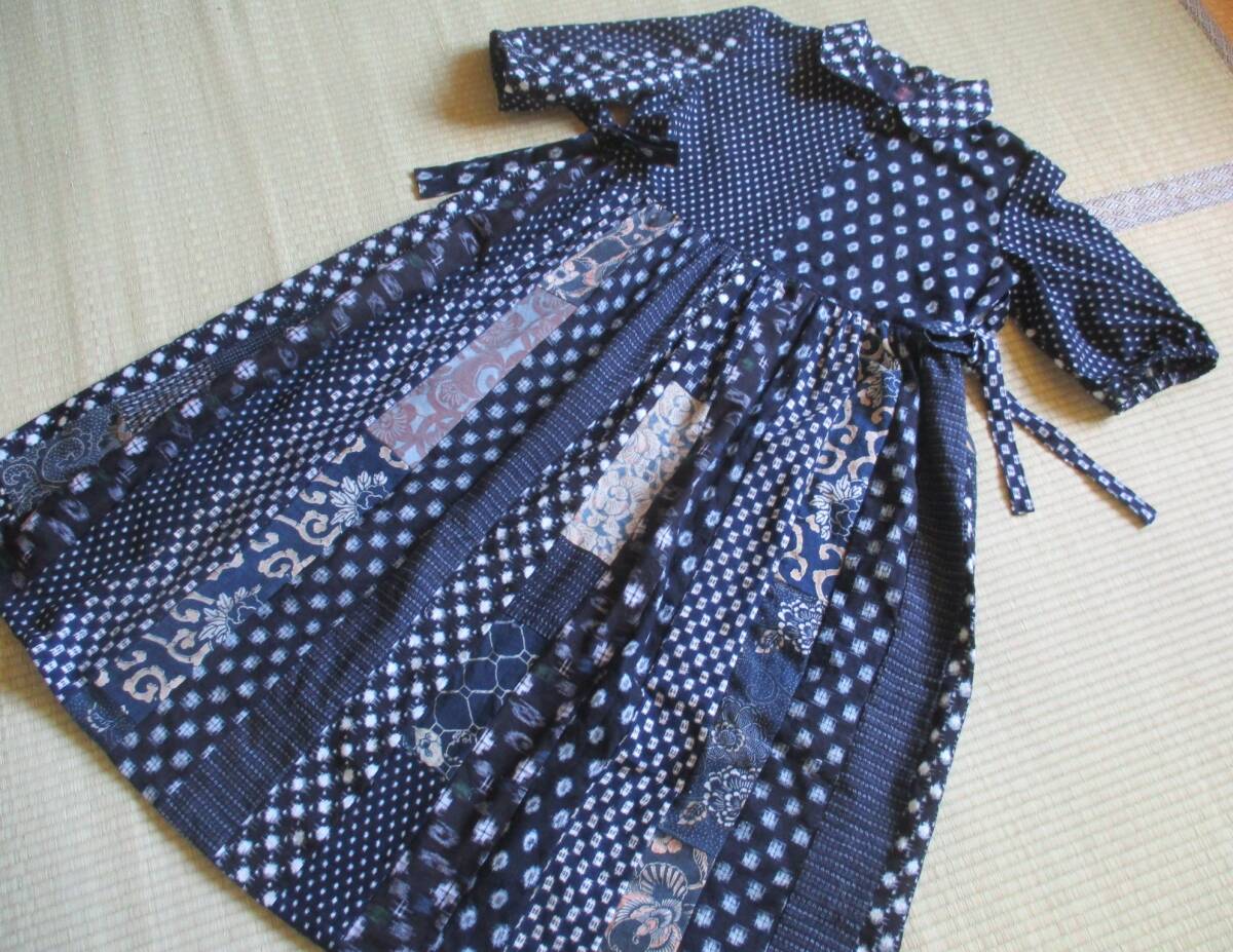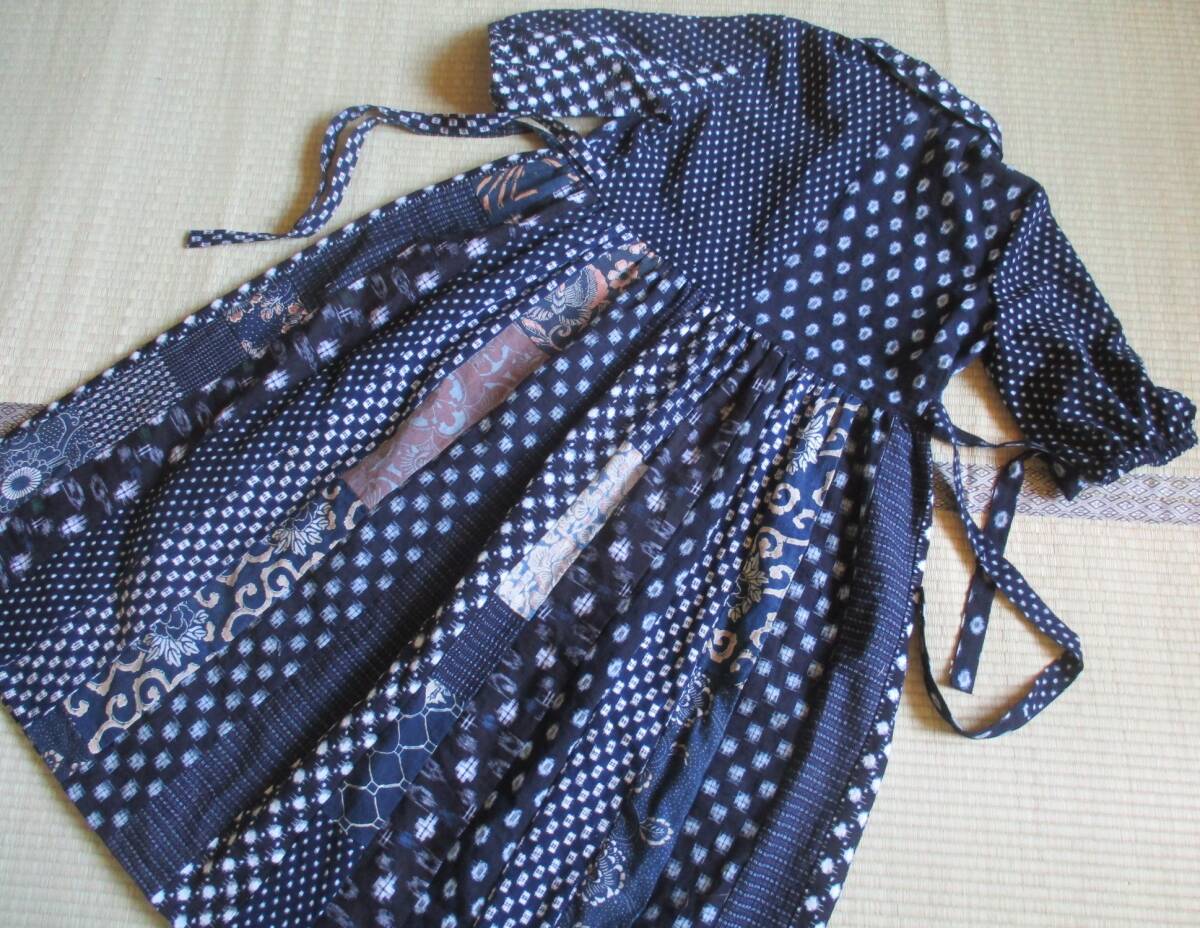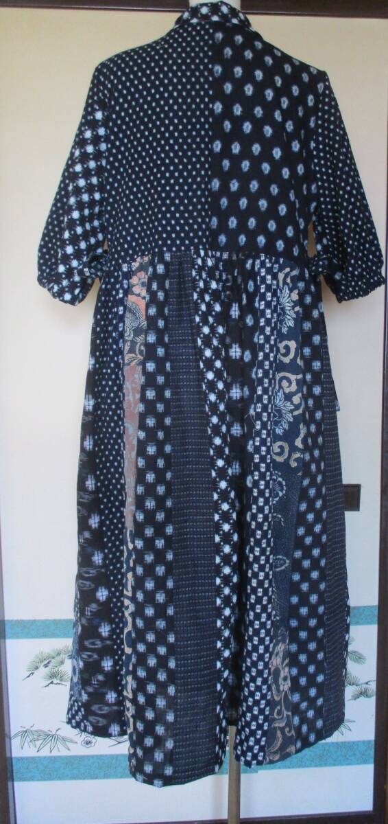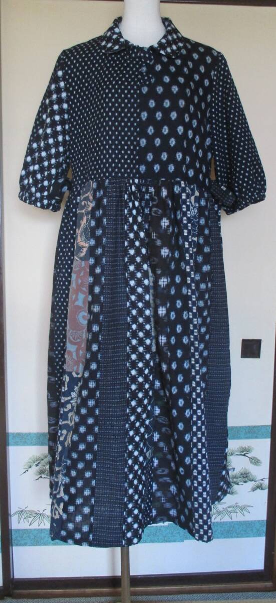 色々な絣、型染めなどを剥いで作りましたパフ袖襟付きワンピースです。右側にシームポッケト1ケ付いております、両サイドに結び紐が付いて可愛らしく、前開きくるみボタン2ケで留まりますが被りです、パフ袖ゴム入りです。