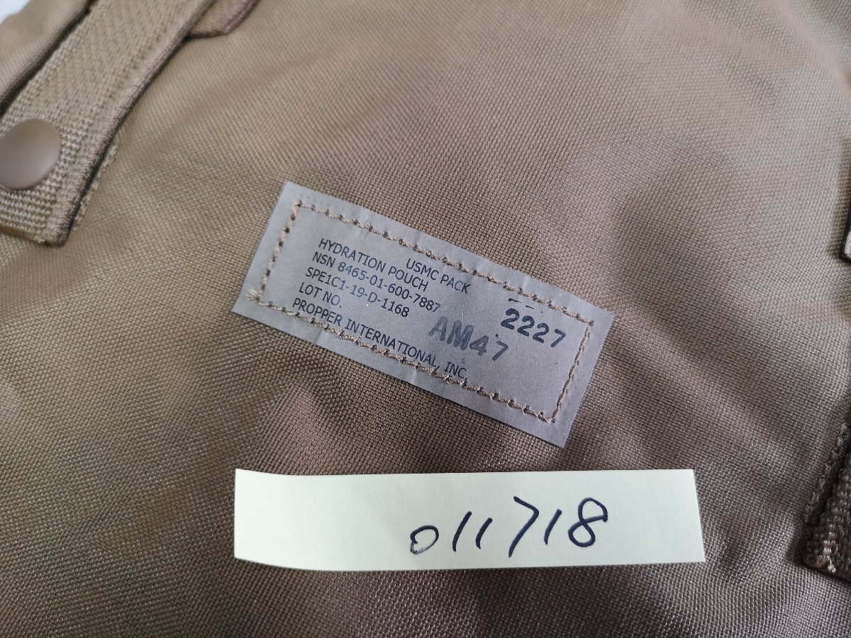 アメリカ海兵隊実物のハイドレーションポーチ(給水パックを収納するポーチ)です。 アメリカ海兵隊の個人装備システムFILBEのパックシステムに含まれるポーチで、リュックやボディアーマーに配備されたウェビングに取り付けられるようになっています。 マチはありませんが、十分な大きさがある為、サブバックとして、ストラップを付けてメインバックどちらでも使用して頂けます。 ●サイズ:約35 × 約24cm ●素材:ナイロン。●状態:デッドストック 。 全国ネコポス便200円にてお送りいたします、落札価格にプラスでお願いいたします。