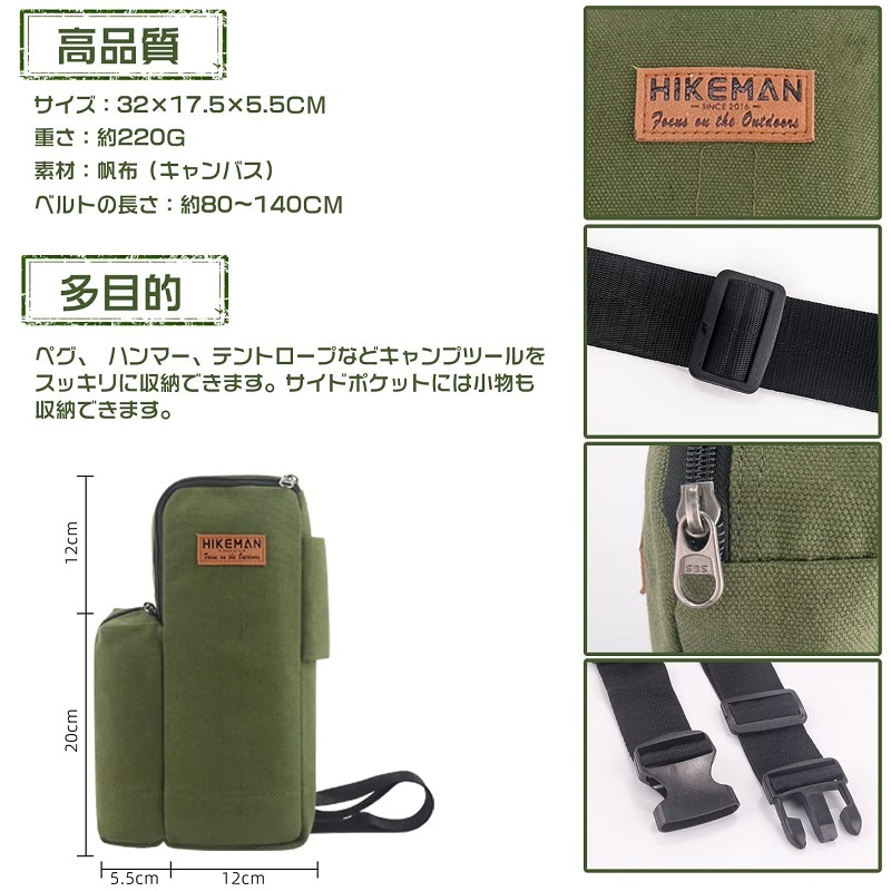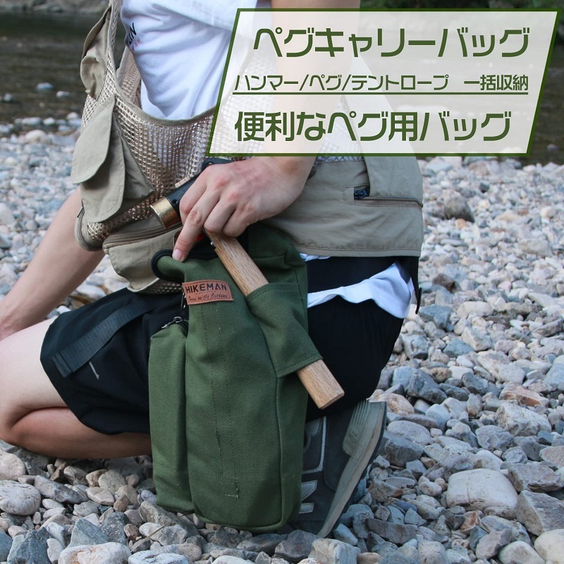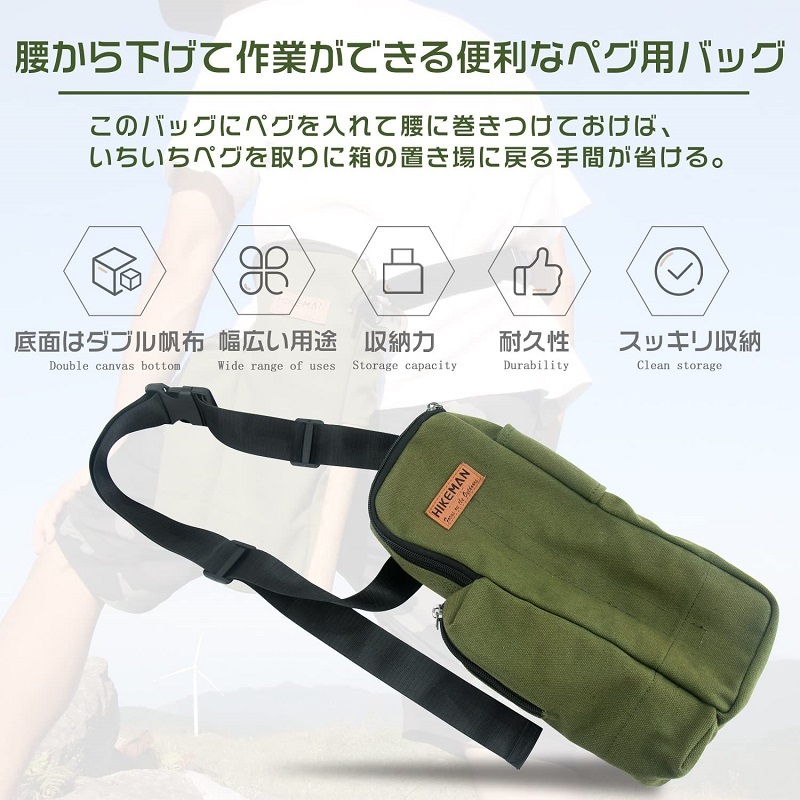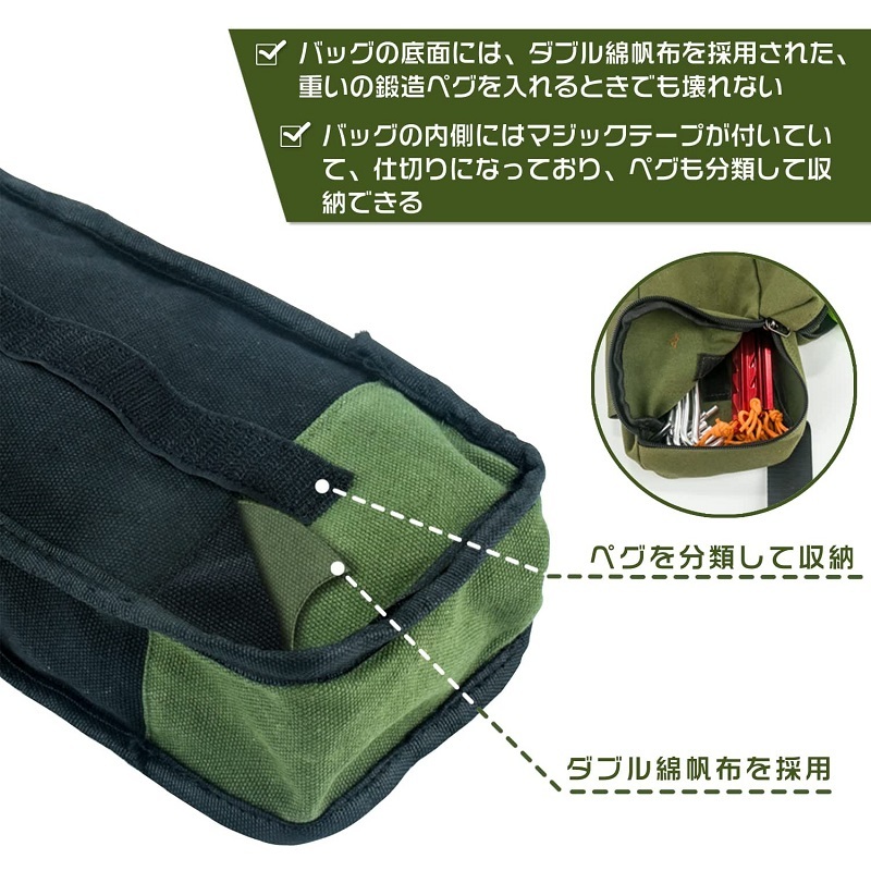 ■新品未使用品■ カラー:アーミーグリーン・【ブラック完売】 ペグケースは帆布で縫製もしっかりしており、重たいペグやハンマーなど設営用小型道具を収納してくれます。 底面は帆布を重ね合わせたダブル帆布となっており、ペグの先端が突き抜け難くなっております。 ファスナーは高強度なSBS素材を使用しており、耐久性があります。 内部は中心にマジックテープがあり、間仕切りが出来ます。 その為二種類のペグが別々にが分けて収納可能に! ペグバッグの側面にはハンマー差しも着いており、反対側にはもう一つのミニ袋付きで、ロープも収納可能です。 メッセンジャーバッグのように肩掛けや、大工さん等が使う腰巻の工具入れのようなウエストバッグとしてもご利用頂けます。 キャンプに必要なお箸やスプーン等、食事用道具の収納としてもご利用頂けます。 |