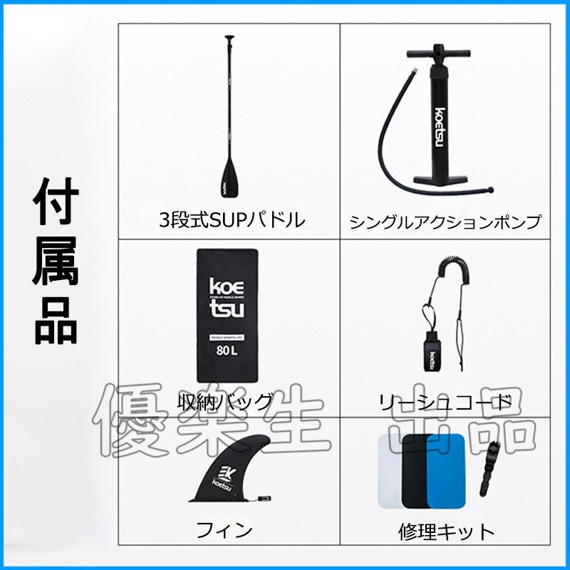 サーフボード ×1+3ピース組み立て式パドル(単一パドル) ×1+シングルアクションポンプ ×1+収納バッグ ×1+リーシュコード(足首用) ×1+フィン(魚のヒレ) ×1+補修キット ×1