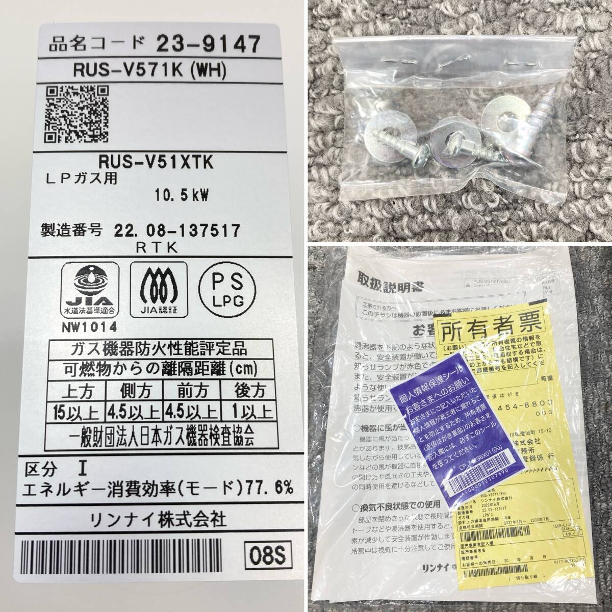 現状品 / Rinnai リンナイ ガス瞬間湯沸器 RUS-V571K(WH) 寒冷地仕様 LPガス/プロパンガス用 RUS-V51XTK 2022年製 給湯器