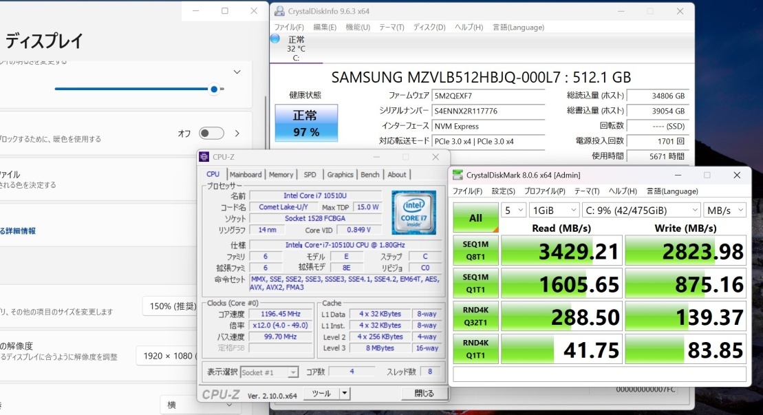 | CPU: 超高速 Intel 超高性能 第10世代Core i7-10510u 1.8Ghz、 4コア8スレッド (ターボ・ブースト利用時の最大周波数 4.9GHz) |