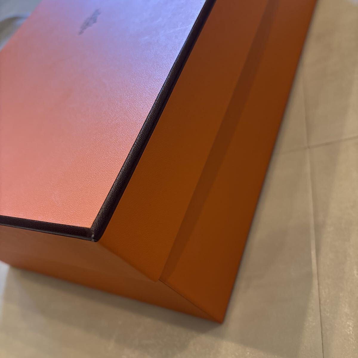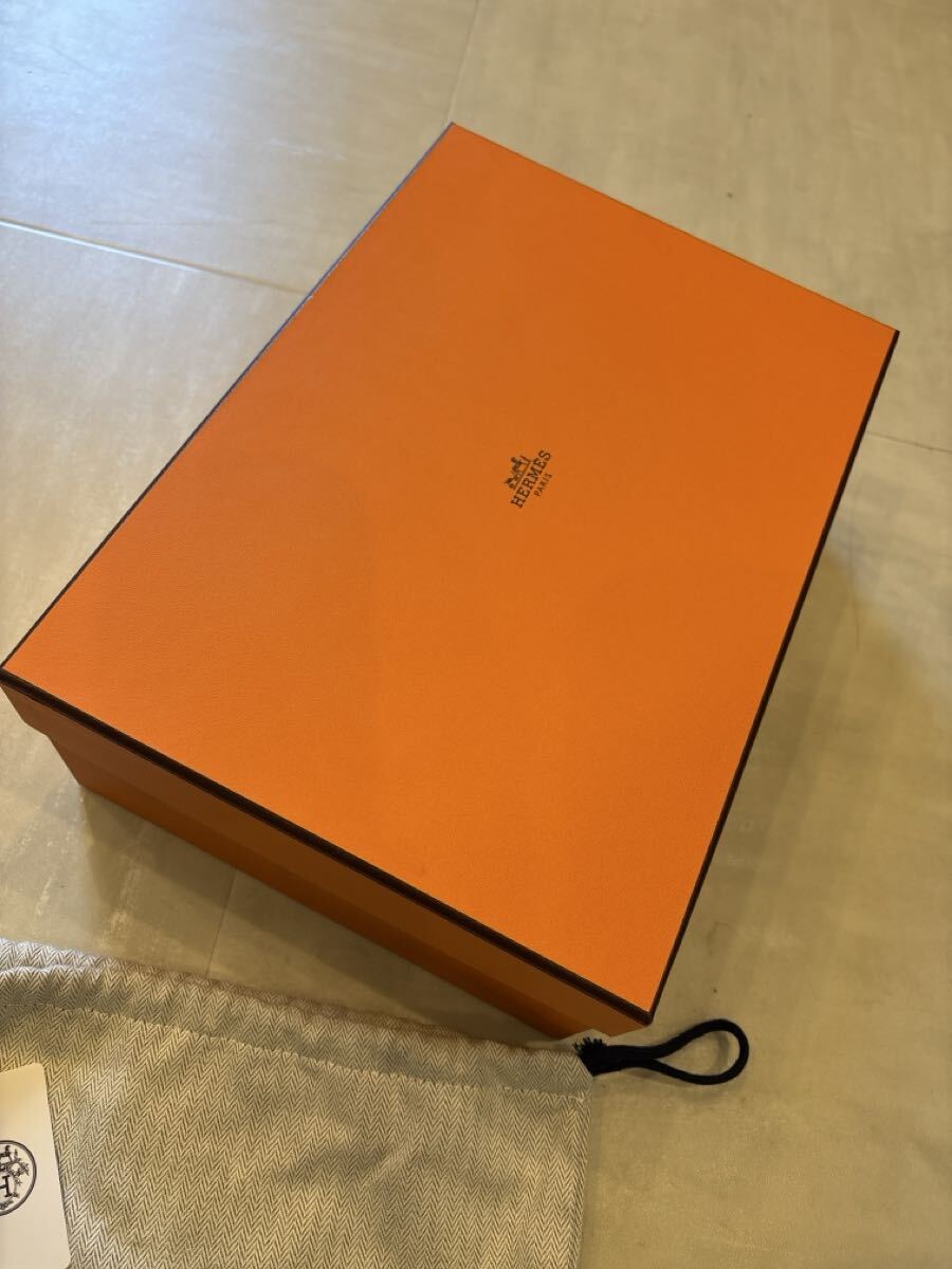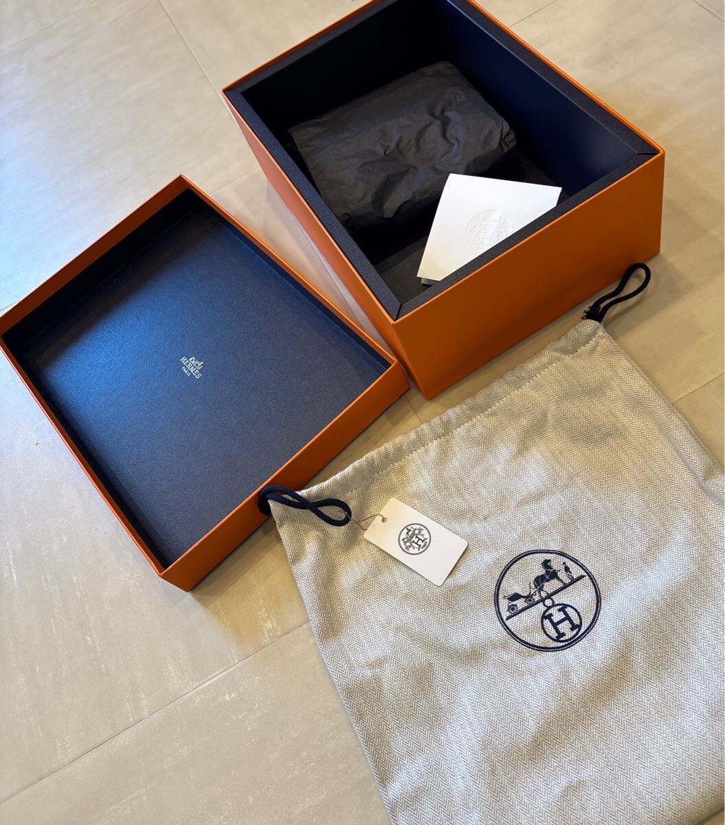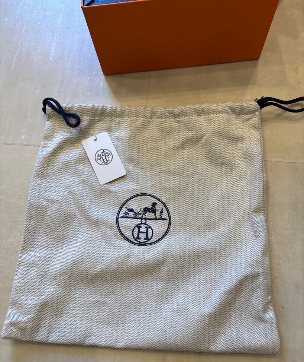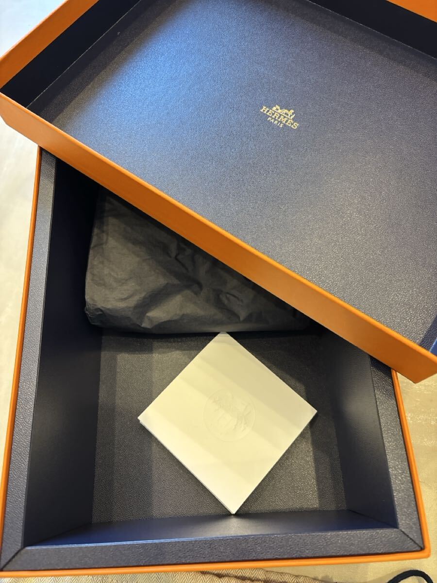 先日エルメスで購入時についてきたブルーボックスです。こちらのボックスはかなりレアかと。まず普通の商品ではつきません。みるのもなかなかレアかと思います。保存袋の紐もロゴもネイビーになってます。