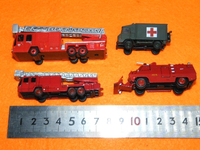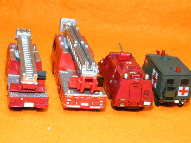 o品名o メーカー??品 消防ハシゴ車 特殊車両 救護など=4台まとめ売りセット♪ミニカー車 Nゲージ1/150 ミニュア ジオラマ車輛モデル系 | ||