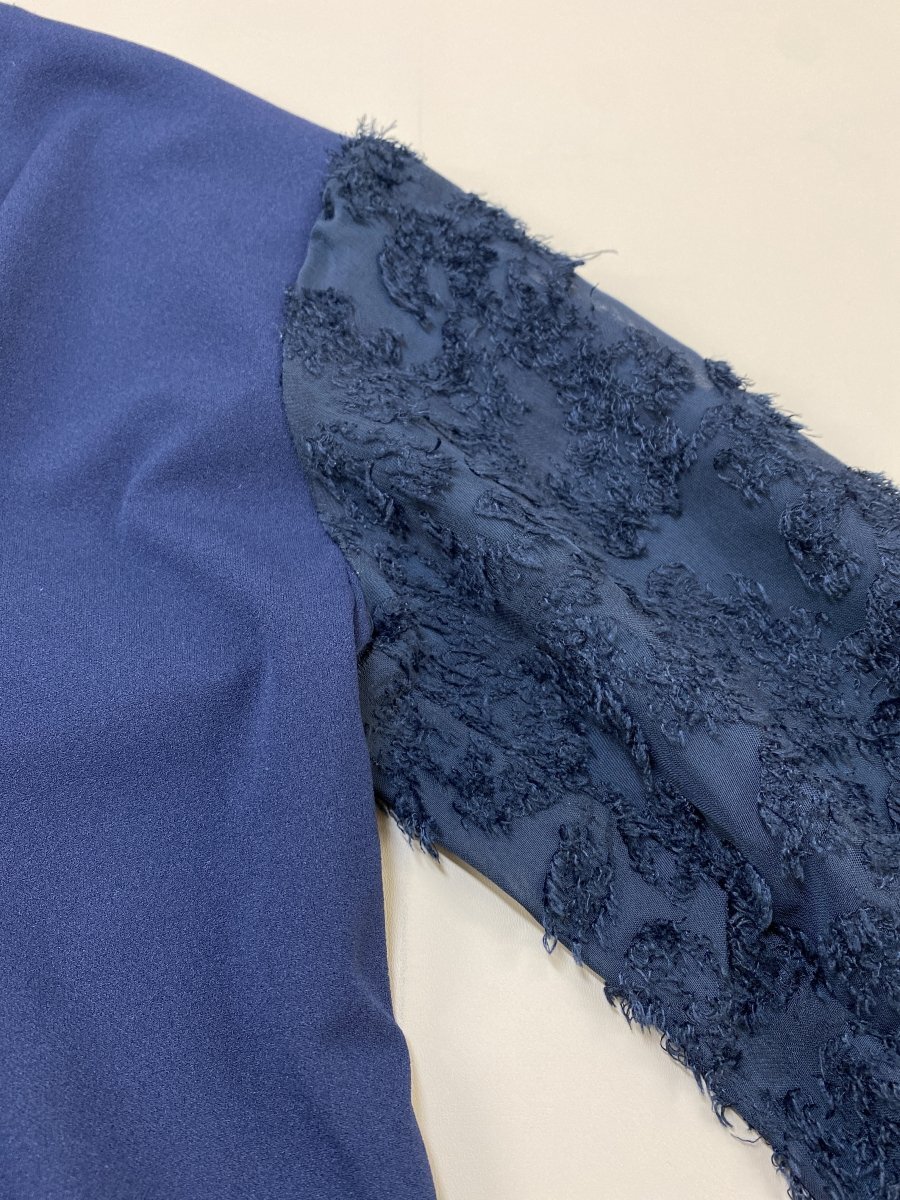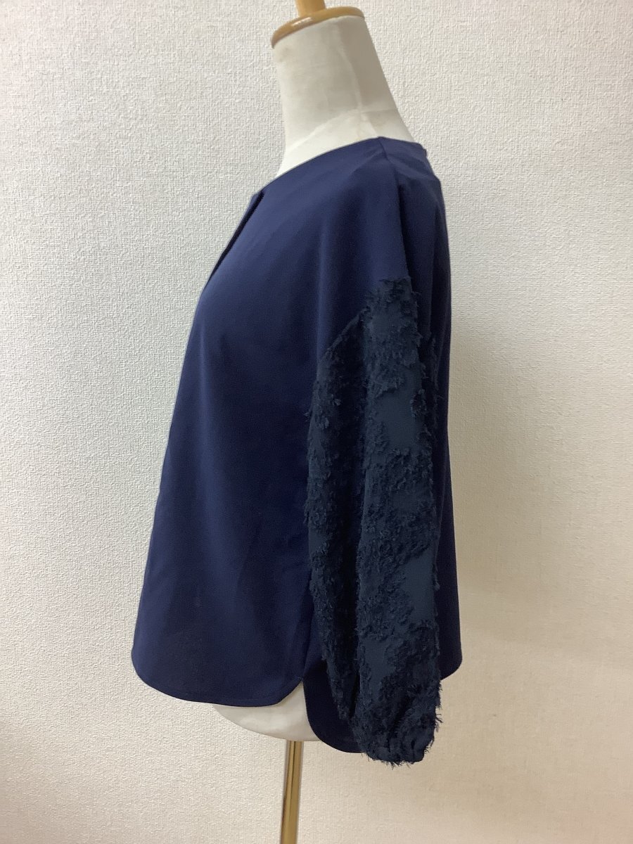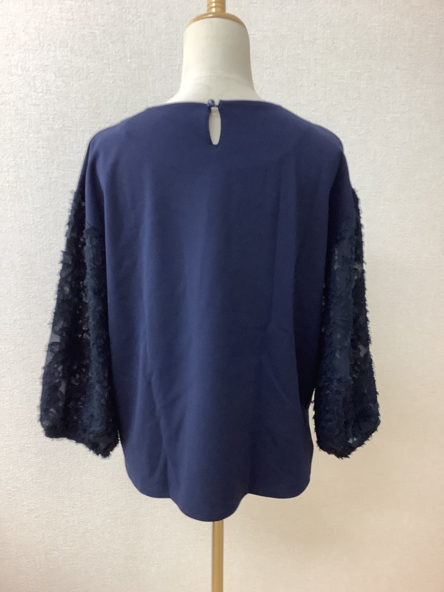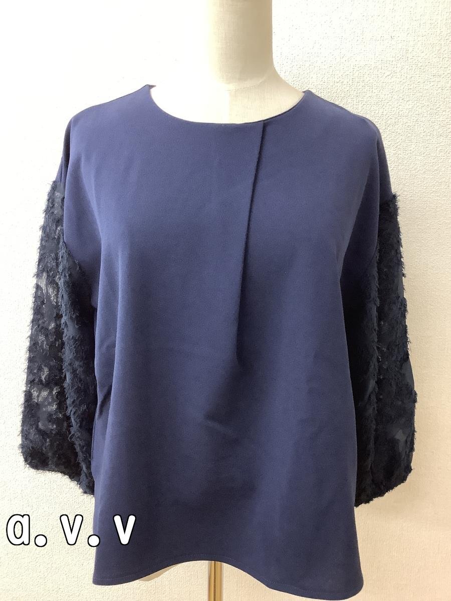 管理番号:10^138161 アーヴェーヴェ (a.v.v) ネイビートップス 袖模様入りシフォン生地 表示サイズ:L 実寸(参考)