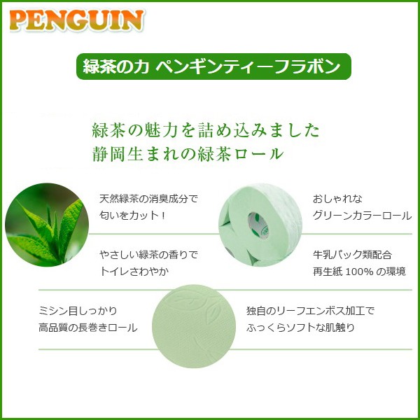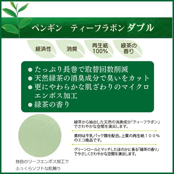 ●30年間販売されているロングセラー商品が進化しました ●天然緑茶の消臭効果と爽やかなハーブの香り ●独自のリーフエンポス加工でいちだんとふっくら・ソフトな肌ざわりを実現しました ●グリーンのカラーロールは静岡産緑茶をイメージ ●牛乳パック配合の上質な再生紙100%使用のエコ商品です ![]() ![]() 【商品詳細】 ロールサイズ:114mm(幅)×35mダブル ケース入数:72個(12ロール入りX6パック) ミシン目:有り 色・表面:グリーン 紙の材質:再生紙100% 香り:緑茶(消臭イン) エンボス:リーフエンボス 1パックサイズ:208X208X342mm 1パック重量:1.7kg ケースサイズ:650×424×350mm ケース重量:10.8kg 製造メーカー:丸富製紙 JANコード:4902727000904 型番:1861 |
