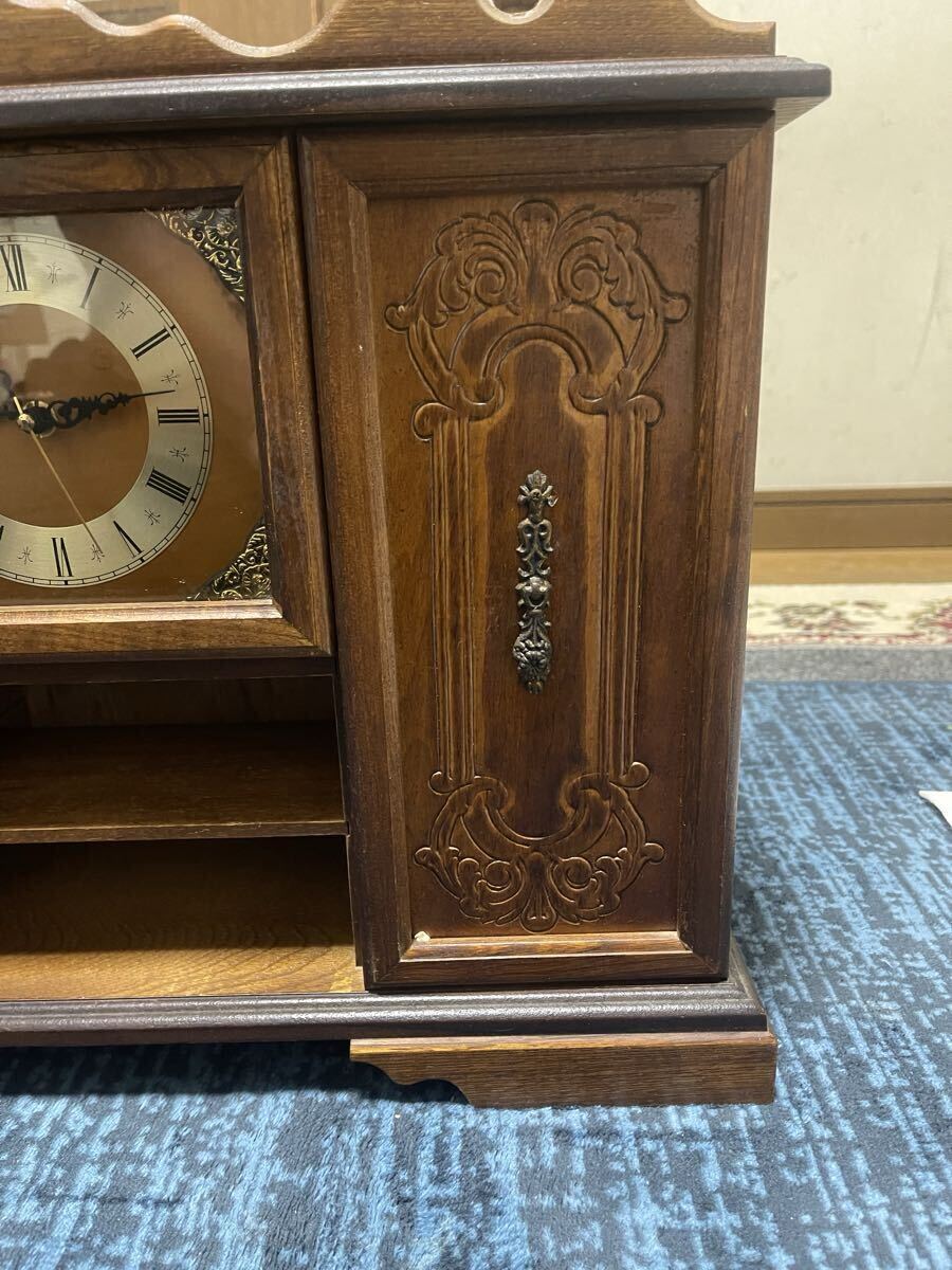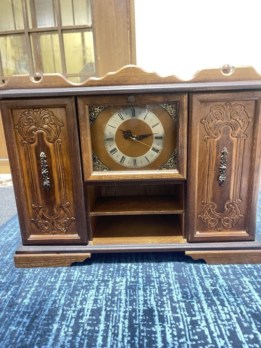 装飾的な木製置時計、アナログ表示でクラシックな雰囲気。