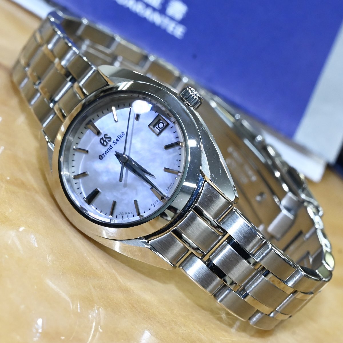 セイコーのマザーオブパール エレガンスコレクション グランドセイコーです。 見やすさ、着け心地の良さ、正確さといったグランドセイコーとしての高い基本性能と機能美はそのままに、繊細な作り込みが施されています。 正統的なデザインのケースは歪みのない美しい鏡面ときめ細やかな筋目に仕上げ分けされており、その対照がフォルムの美しさを際立たせ、あなたの腕で上品な輝きを放ちます。 文字盤にはマザーオブパールを使用しており、角度によって現れる、ほのかな輝きがより一層、優美さを引き立てます。 市場でも圧倒的な人気を誇るメゾンのお品なのでお探しの方も非常に多いかと思います。 ※基本動作確認済。 |