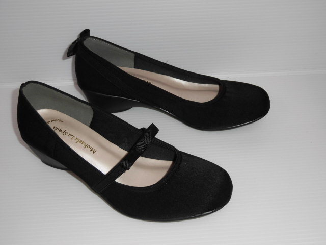Michaela La Spadaの高機能ウエッジパンプス。柔らかアッパーと、たっぷりとクッションが入ったインソールで足裏を優しく癒します。ピアノの発表会や冠婚葬祭などにも最適です。甲のベルトはゴム入りでかかとに回せばバックリボンスタイルに。