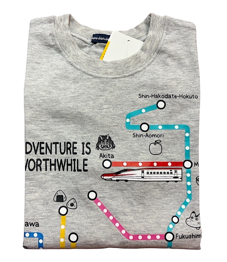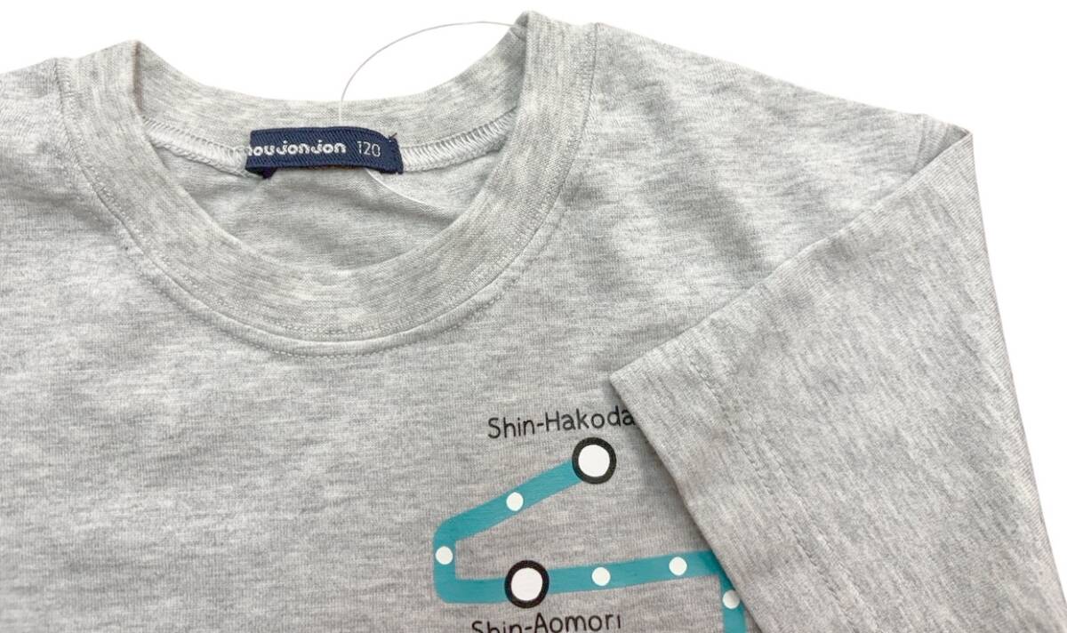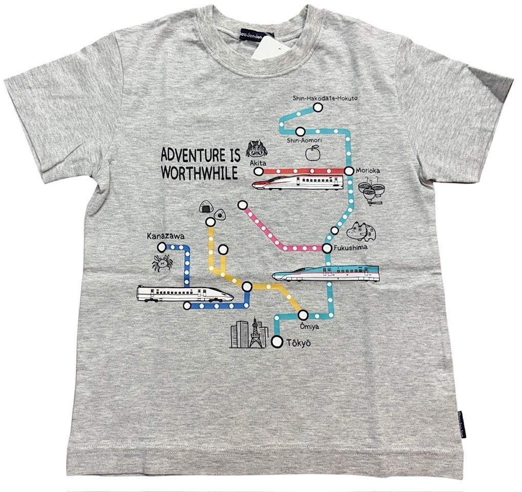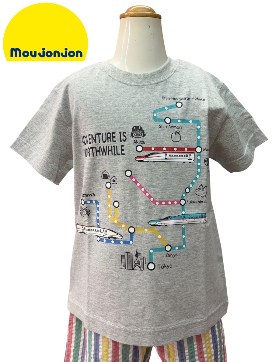 即決 新品タグ付 Moujonjon ムージョンジョン★JR東日本 新幹線 路線図 沿線名物★プリント 半袖シャツ/gr★120cm(7-8才)¥3300