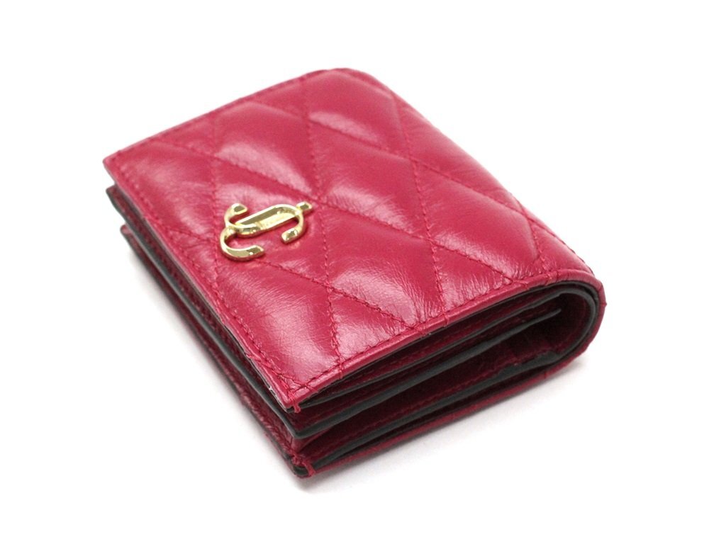 9万新品◆JIMMY CHOOジミーチュウ◆キルティングレザー ゴールドメタルロゴ コンパクト二つ折り財布『FORONE』ピンクレッド