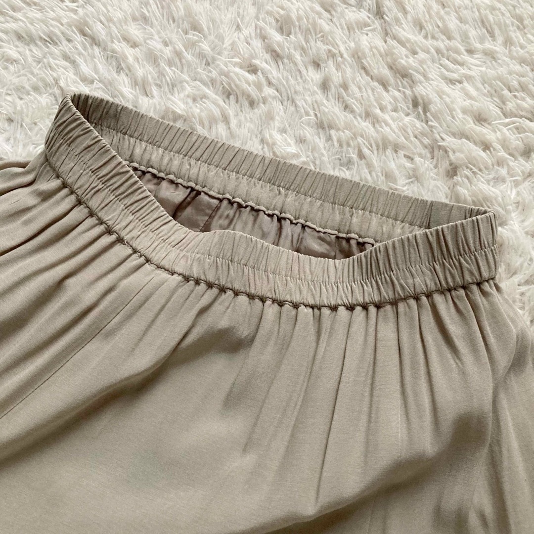 スッキリとさせたウエスト周りはゴム仕様で履き心地抜群!切り替えをつけてゆったりと広がる女性らしいフレアシルエットもポイント。