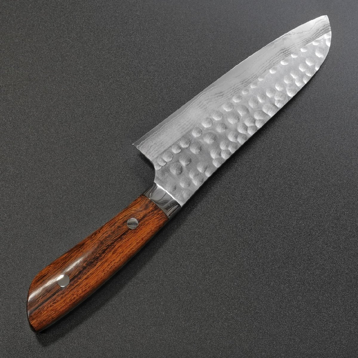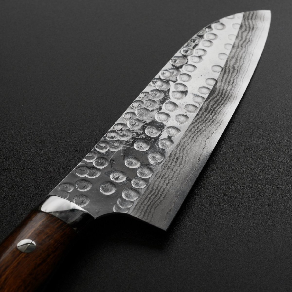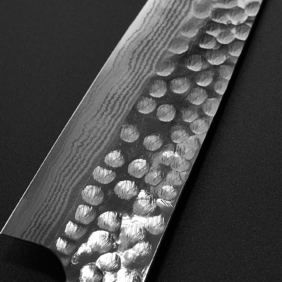 心材の刃は、高硬度、耐摩耗性を高めたSRS13粉末ハイス鋼です。鋼材の青紙スーパーのように炭素を1.50%程度、また耐腐食性のあるモリブデンやバナジウムを高比率で含んでいるため、驚異的な切れ味の持続性と鋭い切れ味があります。またSRS13は錆に強い鋼材です。鋼のように錆に弱くないためメンテナンスも楽になります。そしてハンマーで叩かれた槌目模様が、伝統を感じさせるだけでなく、切った食材を張り付きにくくします。